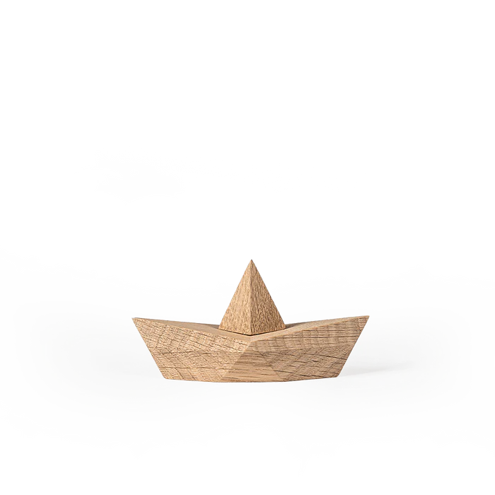With Admiral we are heading for an aesthetic rendering of the childhood paper boat, here created in solid oak and with a hidden magnet that holds the sail in place.