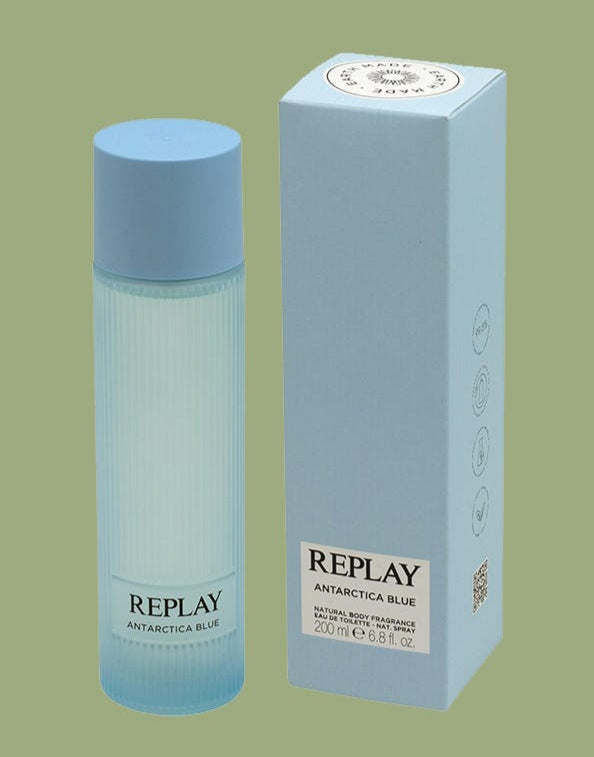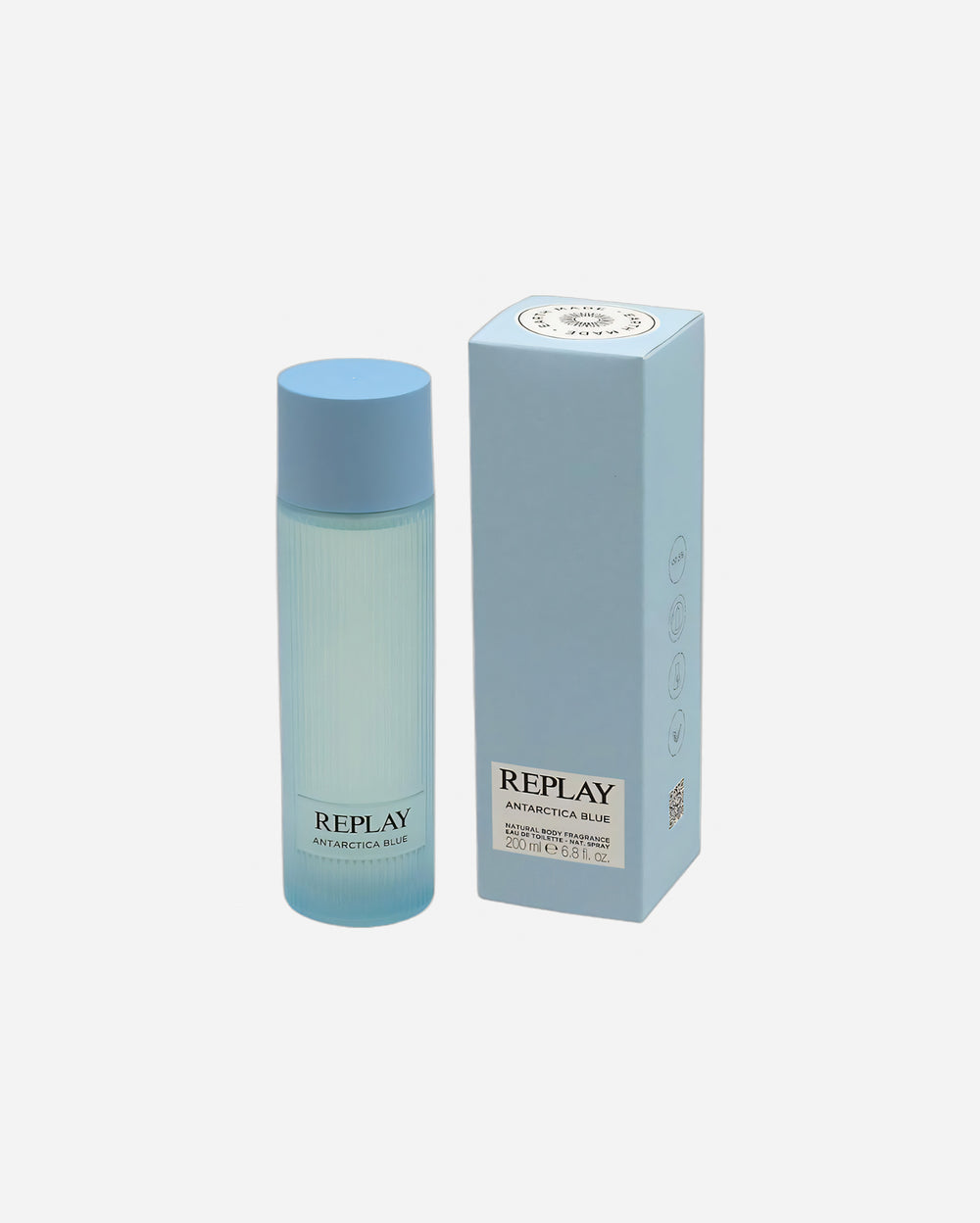 Replay Antarctica Blue is a refreshing and invigorating body fragrance inspired by the cool purity of polar landscapes. Presented in a frosted, ribbed light-blue bottle with matching minimalist packaging, this scent delivers an icy, clean, and airy freshness that energizes your day.