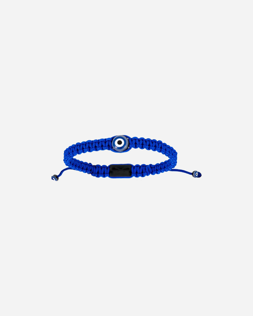 Este brazalete presenta un diseño trenzado de color azul brillante, con un adorno central en forma de ojo turco, que se cree que protege contra el mal de ojo. Además, incluye una placa metálica con una "X" grabada. El brazalete tiene un cierre ajustable con cordones, permitiendo adaptarlo a diferentes tamaños de muñeca.