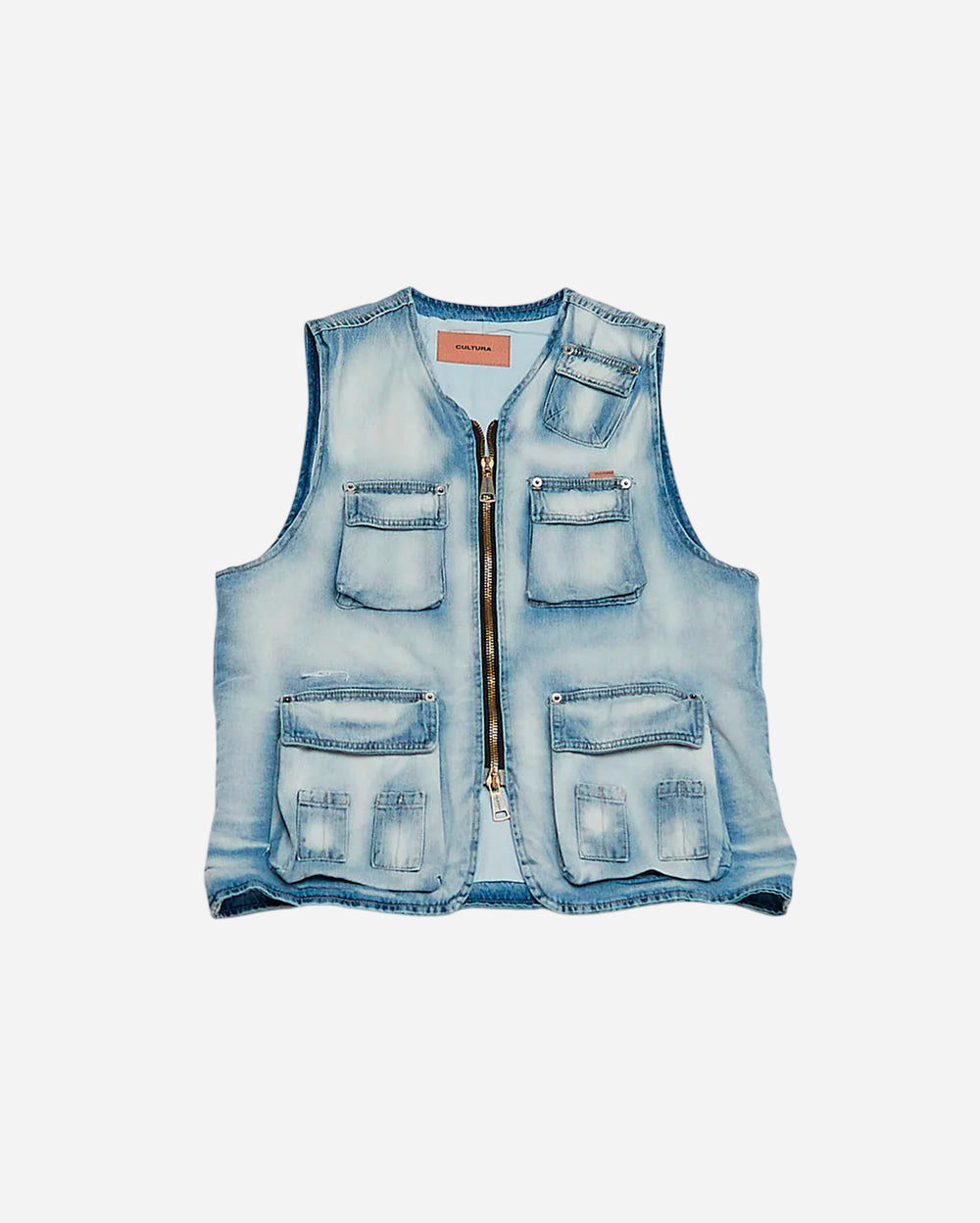 This Cargo Denim Vest delivers a rugged, utility-driven look with a distinctly vintage wash. Crafted in a light blue distressed denim, it features multiple cargo pockets that add both function and character, making it a standout layering piece for everyday wear or outdoor-inspired styling.