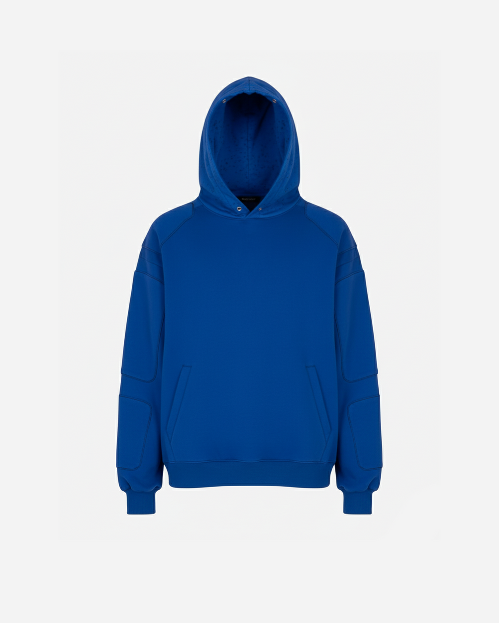 Cobalt blue heavyweight French terry hoodie with nylon hood and double-layer panels on the arms.