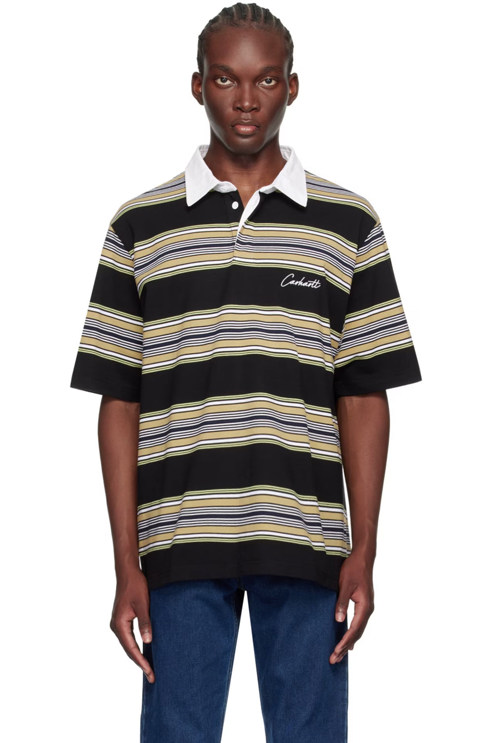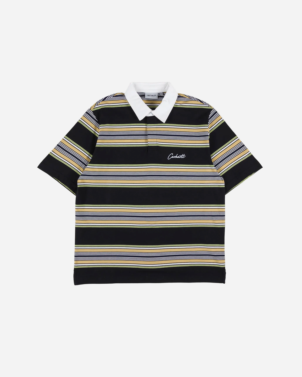 La camiseta de rugby Carhartt WIP Gaines fusiona la estética deportiva vintage con el estilo de trabajo característico de la marca. Confeccionada en punto de algodón grueso, esta camiseta de manga corta presenta rayas horizontales en contraste en tonos negro, mostaza y blanco para un look atemporal y atrevido.