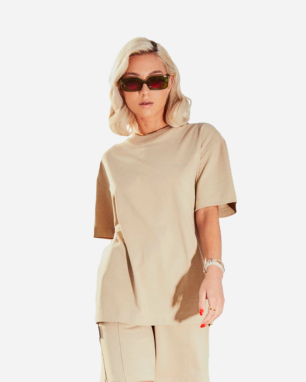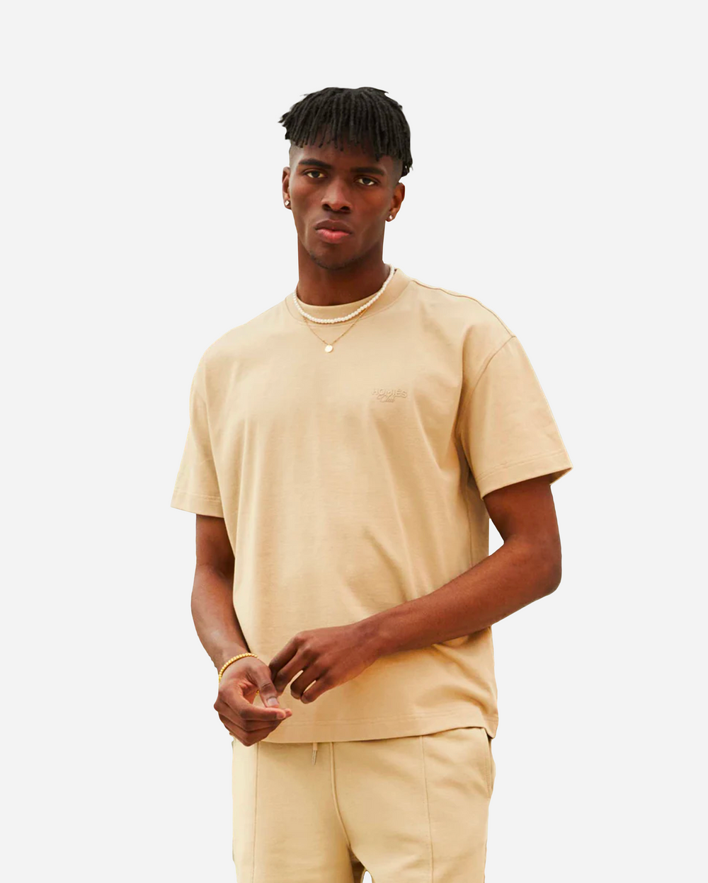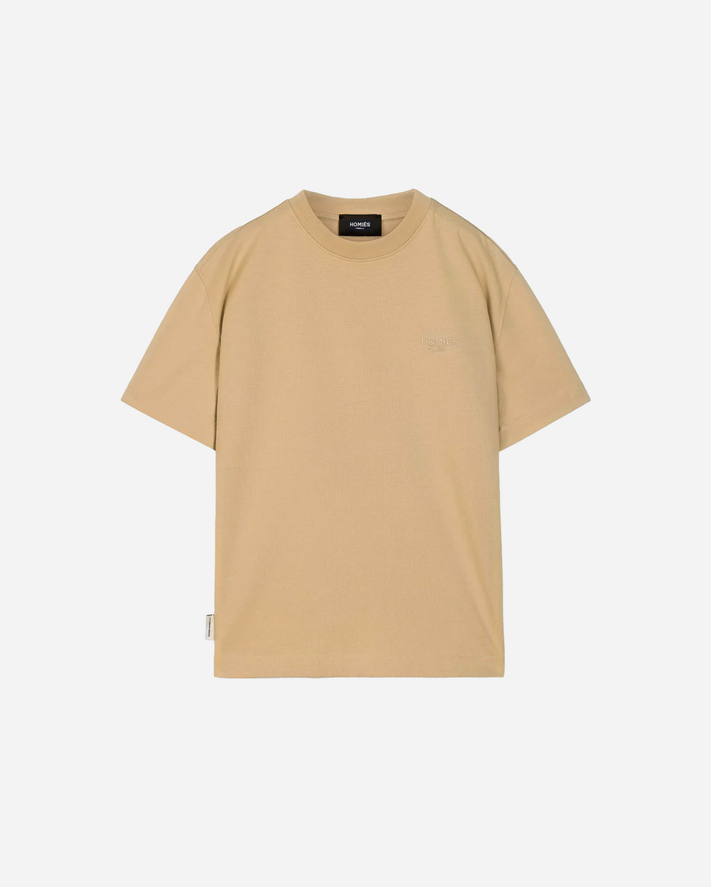 Relaxed fit t-shirt made of 100% double jersey cotton in safari with an enzyme finish. Featuring an original Homiés Club logo in high desirty print on the chest in fabric matching colour. Inspired by our community wardrobe essentials, this piece comes as a high-end must to wear day to day.