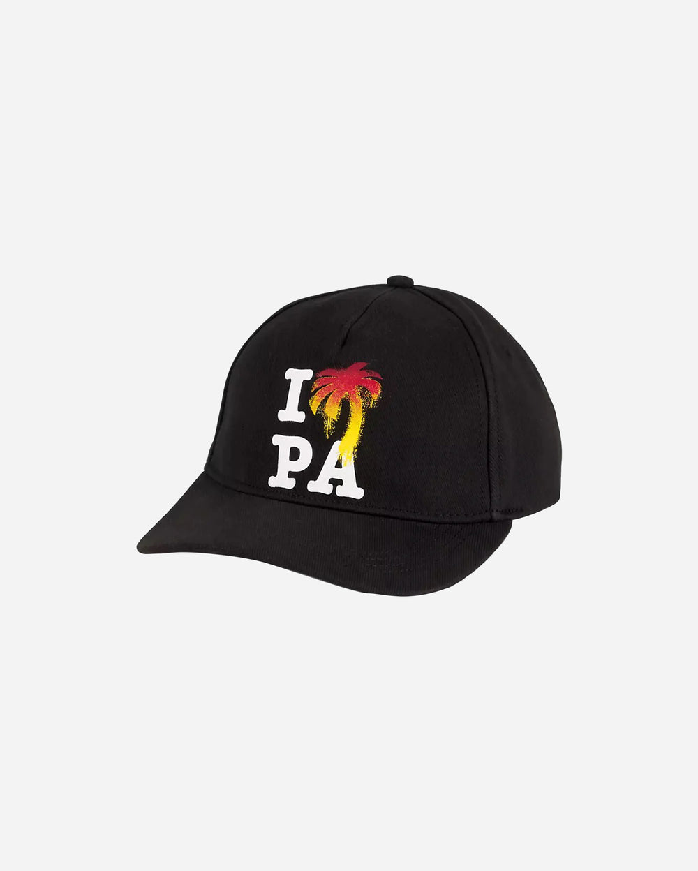 A playful twist on a classic streetwear accessory, the Palm Angels “I ♥ PA” Cap delivers the brand’s unmistakable West Coast–meets–luxury identity in a bold, graphic format. Crafted from durable black cotton, the cap features a front print that reimagines the iconic “I ♥” motif—this time replacing the heart with a spray-painted palm tree in vivid red and yellow tones. It’s equal parts rebellious and nostalgic, capturing Palm Angels’ skate-culture roots with a refined, fashion-forward edge.