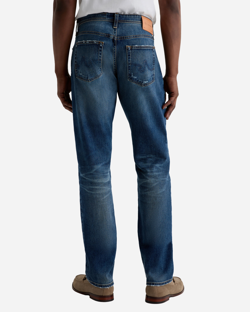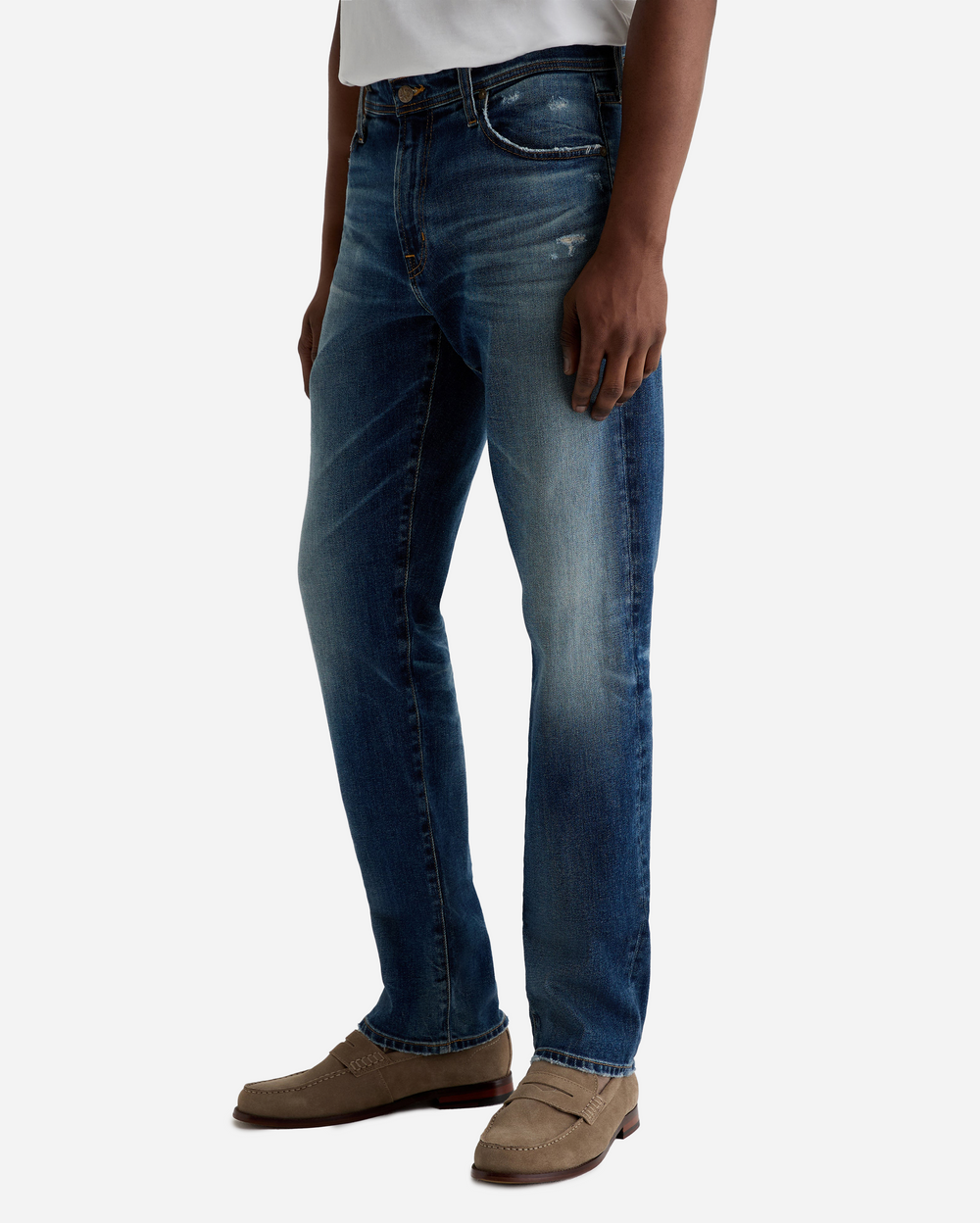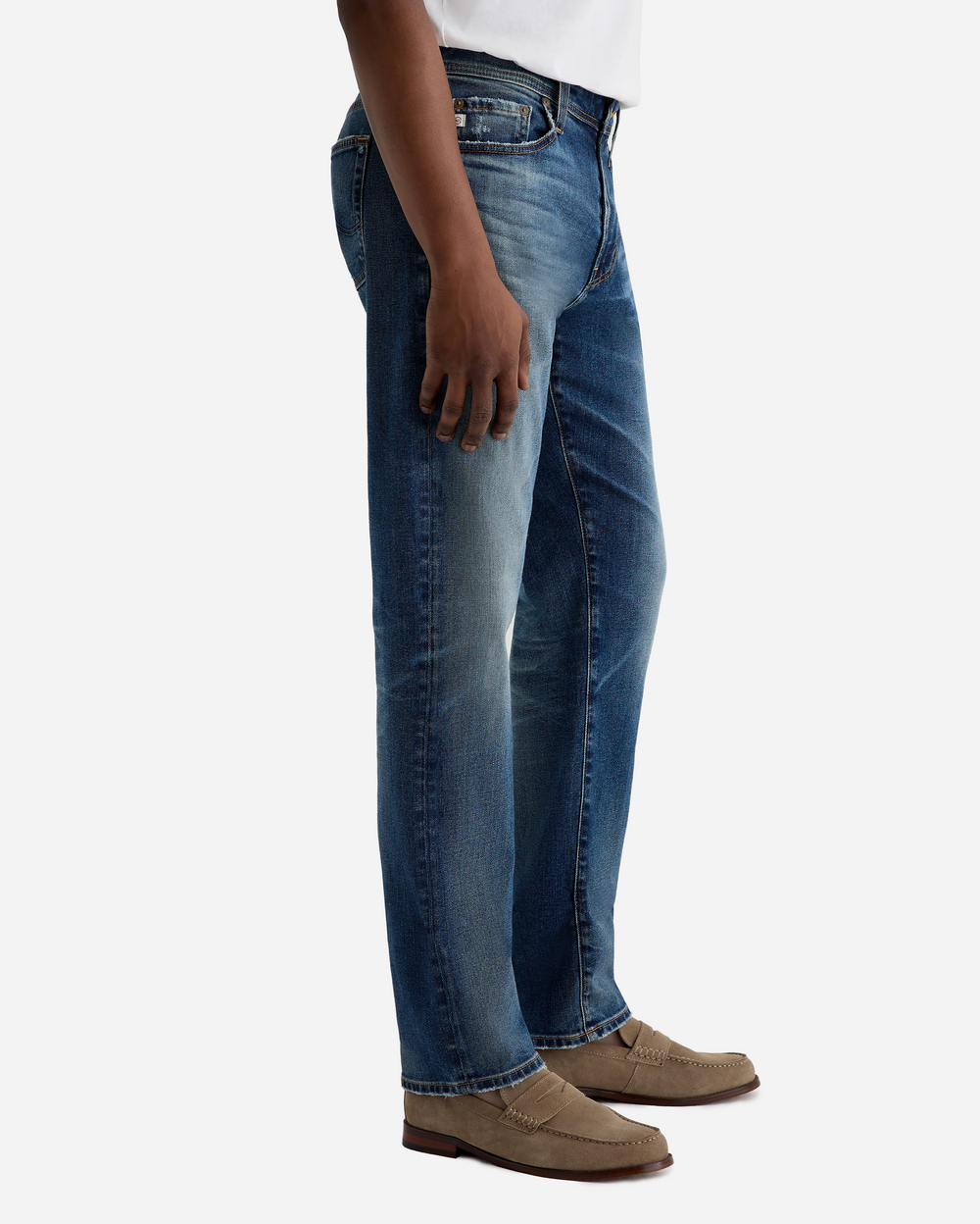 Nuestro jean Ex-Boyfriend Slim para mujer presenta un corte holgado y ajustado en un lavado índigo medio envejecido por AG. Tiene un deslavado que simula el uso, dobladillos traseros deshilachados y un poco de desgaste en los bolsillos para emular 10 años de uso. Confeccionados con denim japonés elástico de 10 oz para mayor comodidad, estos jeans de tiro medio tienen un ajuste relajado desde la cadera hasta la rodilla, antes de estrecharse para un acabado slim.