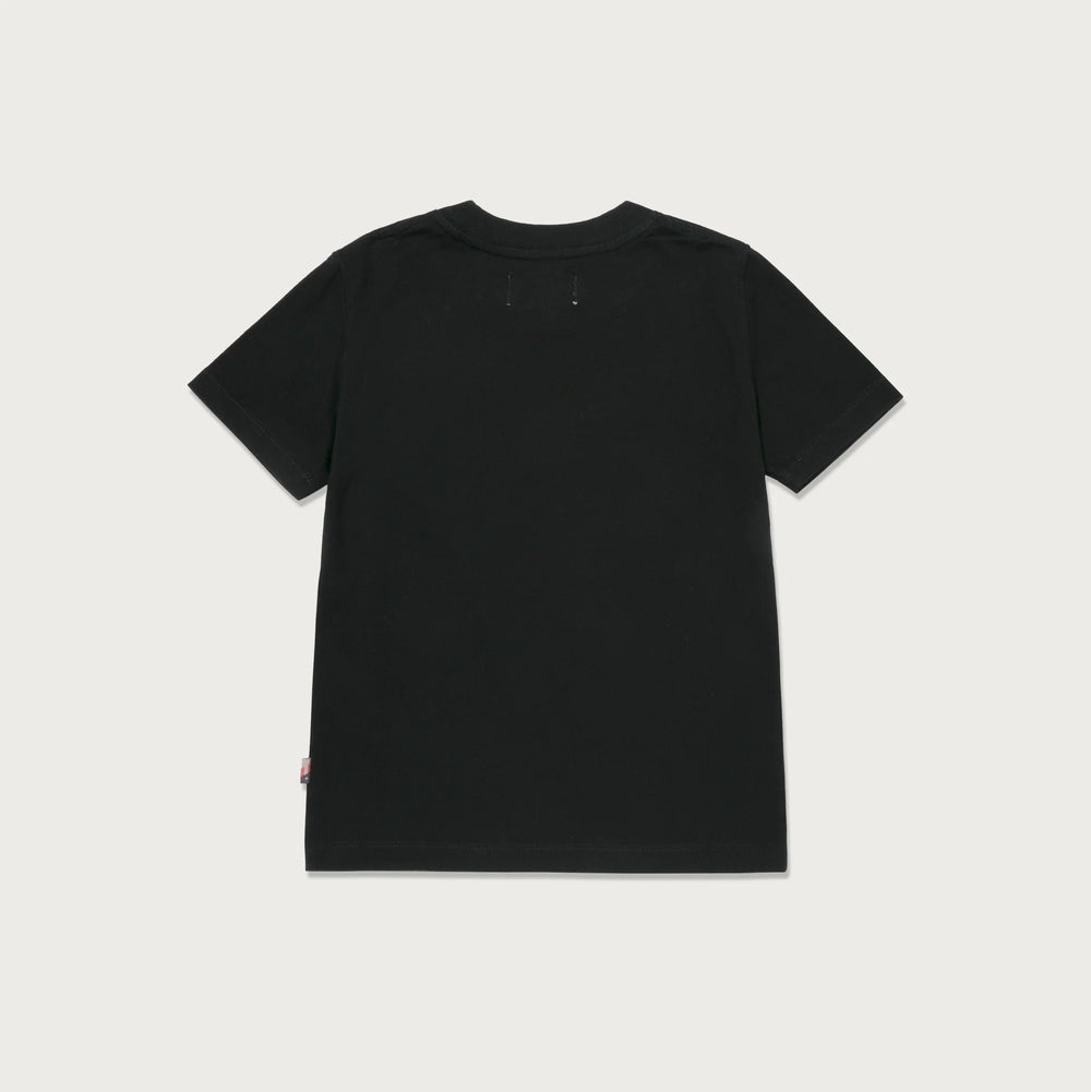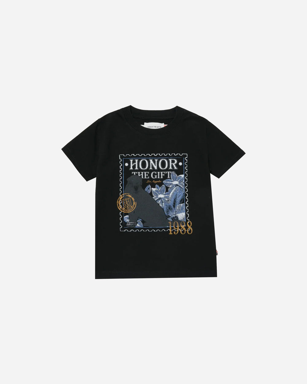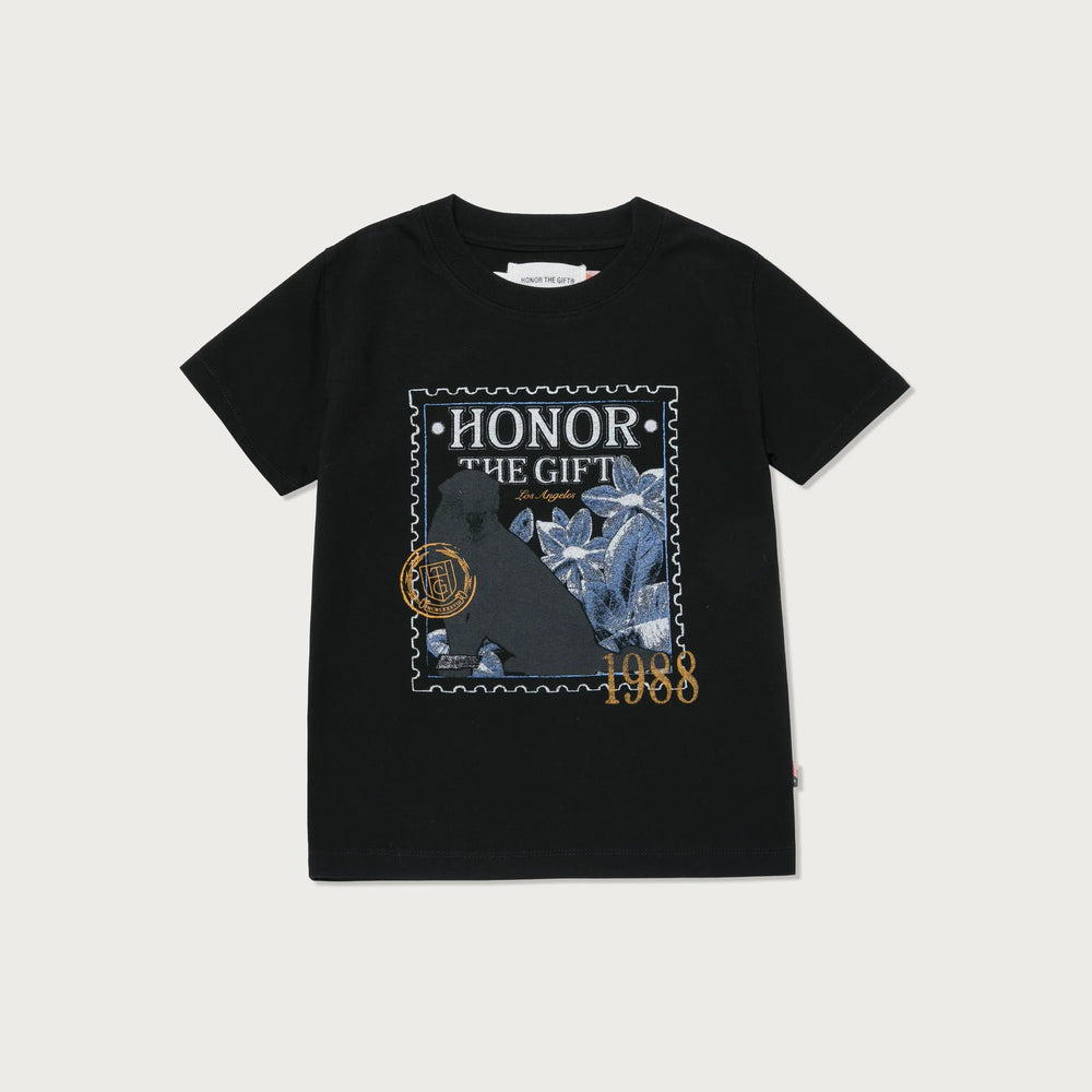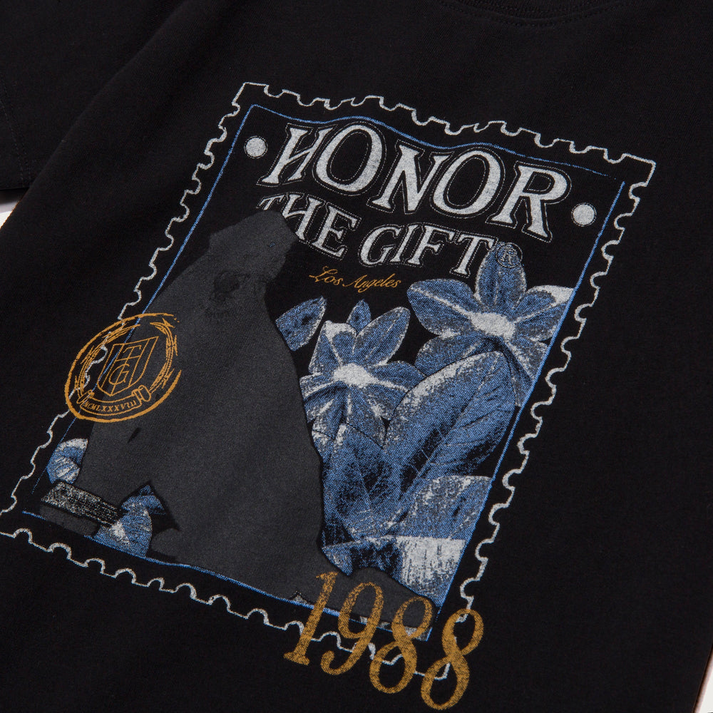 Esta camiseta presenta un diseño que simula un sello postal con un gato negro y la frase "HONOR THE GIFT". La camiseta está hecha de algodón y tiene un corte clásico con mangas cortas.