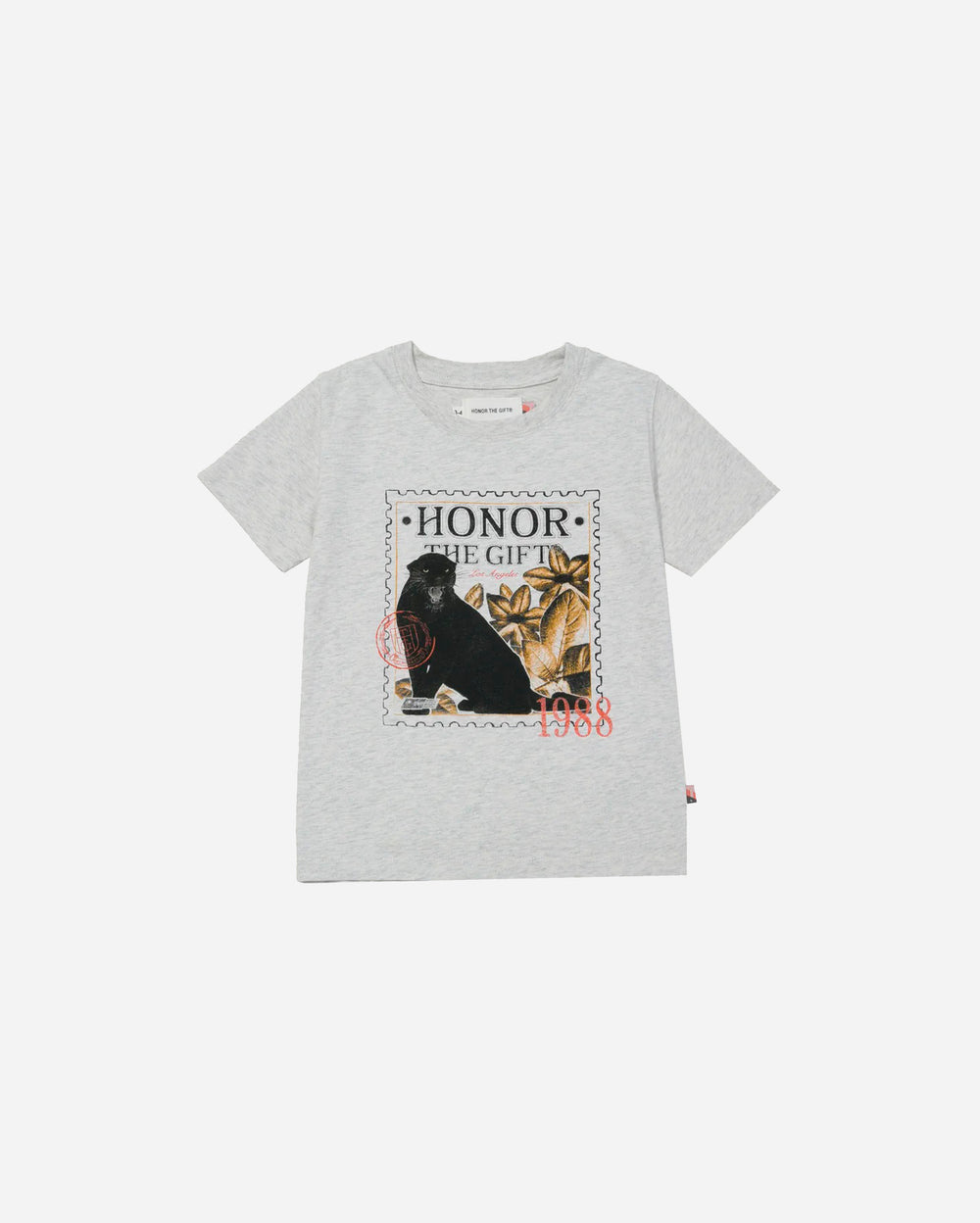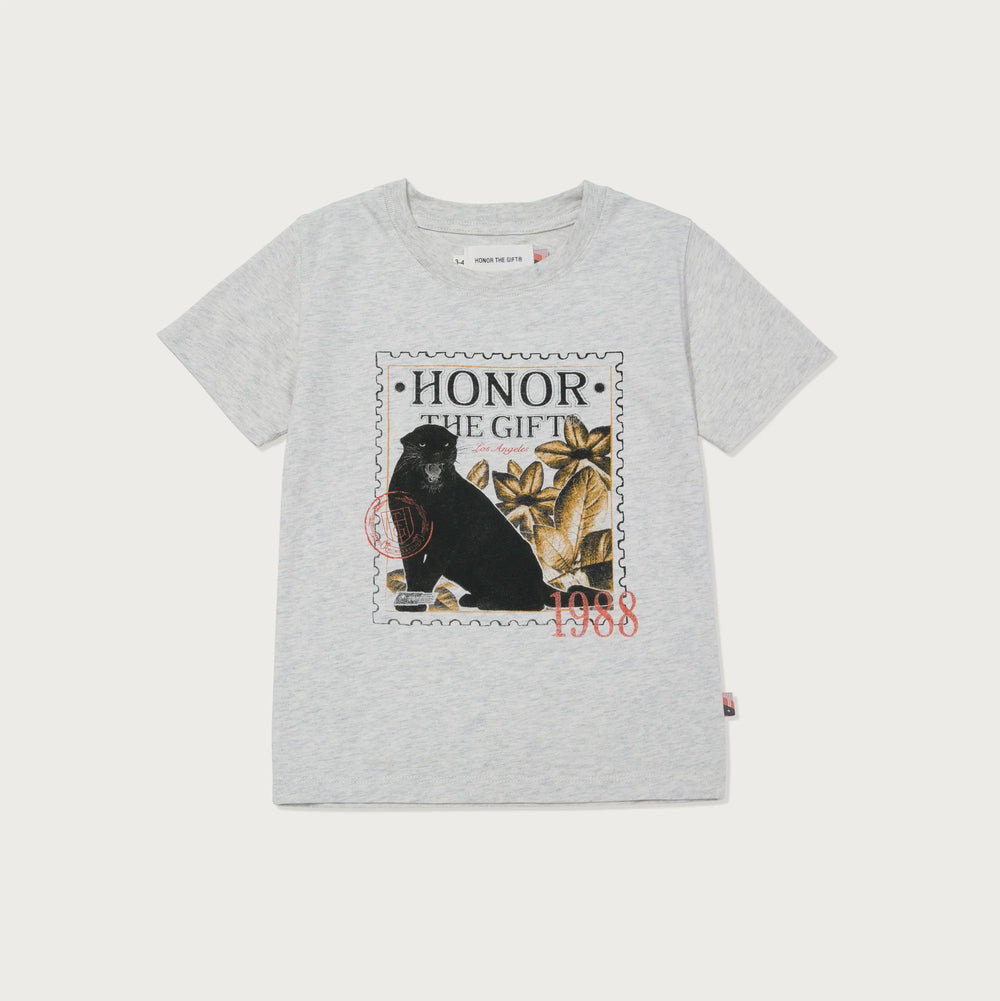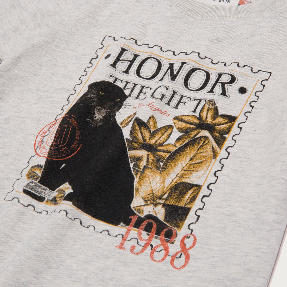 Esta camiseta presenta un diseño que simula un sello postal con un gato negro y la frase "HONOR THE GIFT". La camiseta está hecha de algodón y tiene un corte clásico con mangas cortas.