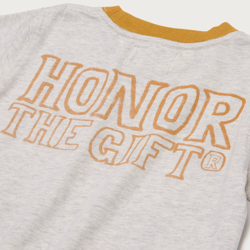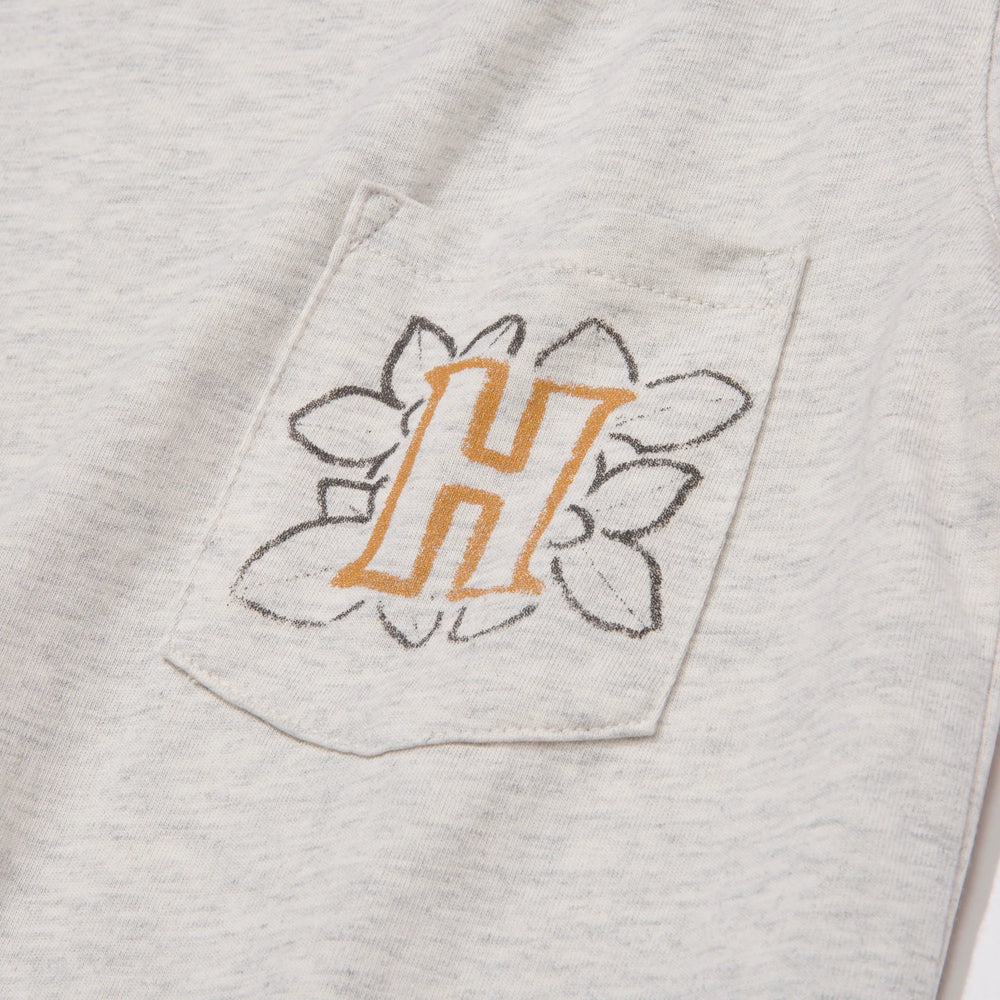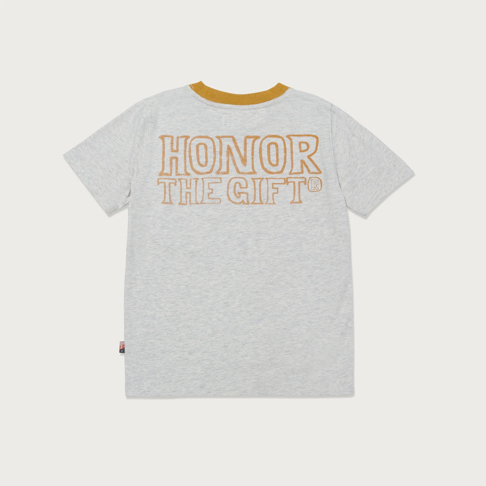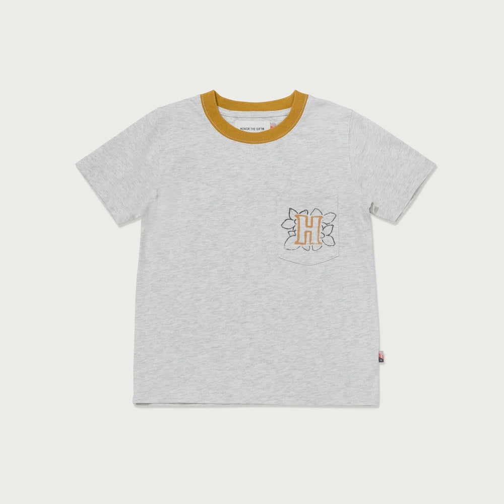 Camiseta gris de manga corta con cuello redondo ribeteado en amarillo mostaza. En el bolsillo del pecho izquierdo, deslumbra un bordado que combina motivos florales en tonos grises y amarillos con la letra "H" en el centro. La etiqueta en la parte interna del cuello muestra la inscripción "HONOR THE GIFT". La camiseta es de 100% algodón, adecuada para uso casual.