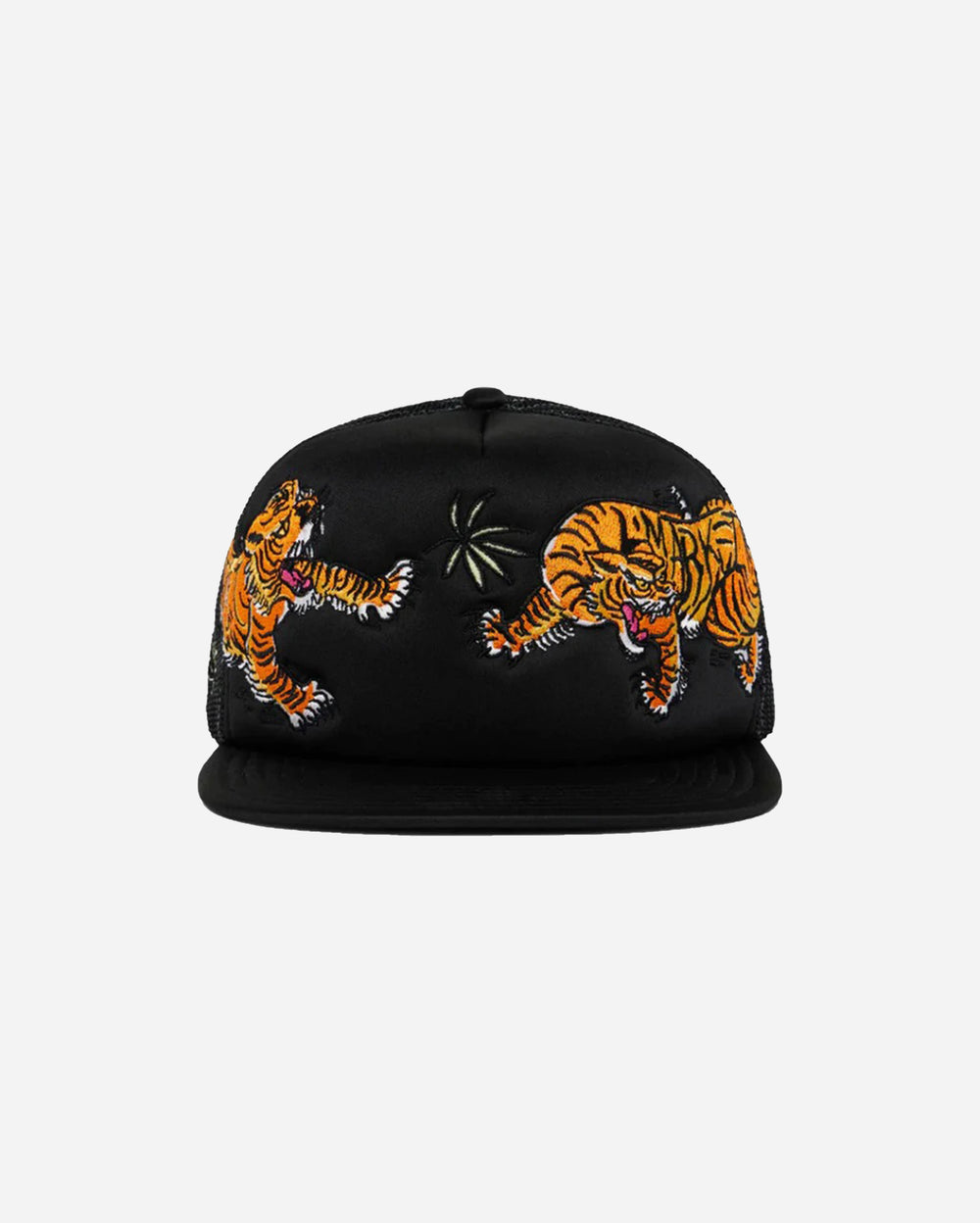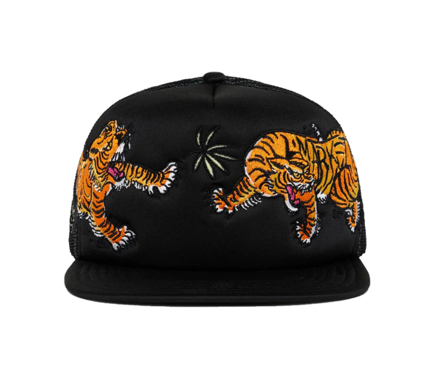 Esta llamativa gorra presenta un diseño impactante con dos feroces tigres bordados en la parte frontal. Los vibrantes detalles de los tigres contrastan a la perfección con el fondo negro de la gorra, creando una pieza que no pasará desapercibida. Confeccionada con un panel frontal de tejido resistente y paneles traseros de malla transpirable, esta gorra ofrece comodidad y estilo para el día a día. Su diseño de cinco paneles le otorga una forma moderna y ligeramente estructurada, mientras que la visera curva protege del sol con un toque urbano. El cierre trasero ajustable garantiza un ajuste personalizado y cómodo para cualquier tamaño de cabeza.