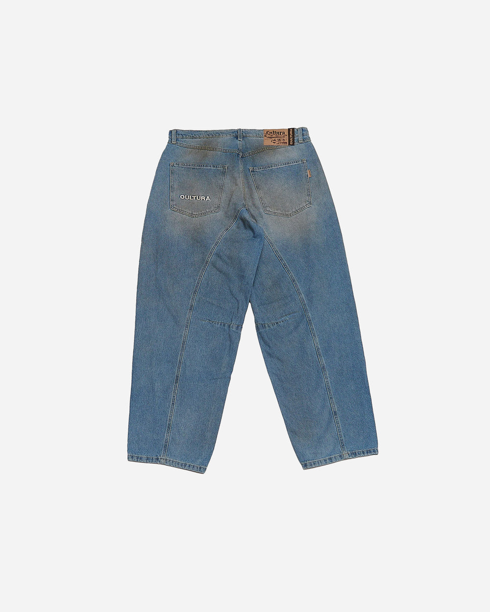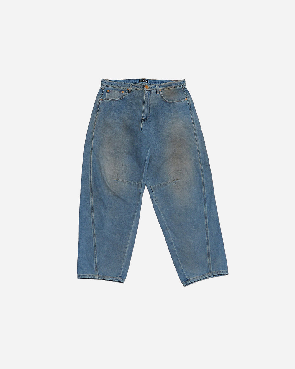 Pantalones de mezclilla con pierna abullonada y caída relajada, tratados con una pátina de lavado sucio y adornados con detalles de costuras desgastadas para lograr un acabado desgastado y lleno de actitud.