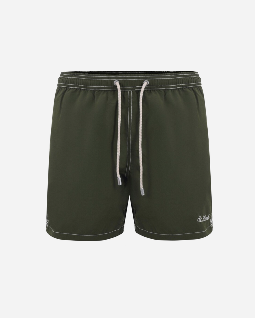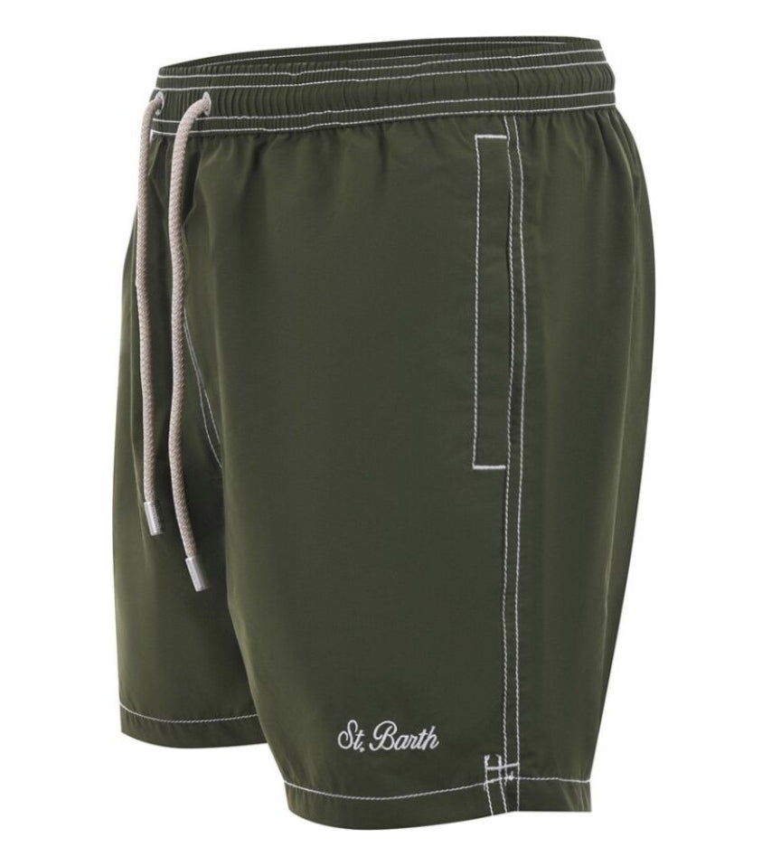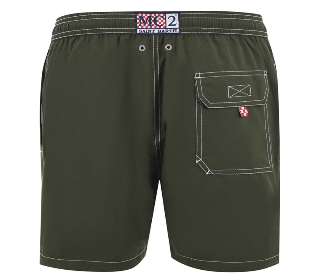 Refined, timeless, and effortlessly elevated these MC2 Saint Barth swim shorts in deep olive green capture the essence of understated luxury. Their minimalist aesthetic is enriched by clean contrast stitching and the brand’s discreet embroidery at the hem, creating a piece that speaks softly yet exudes unmistakable sophistication.
