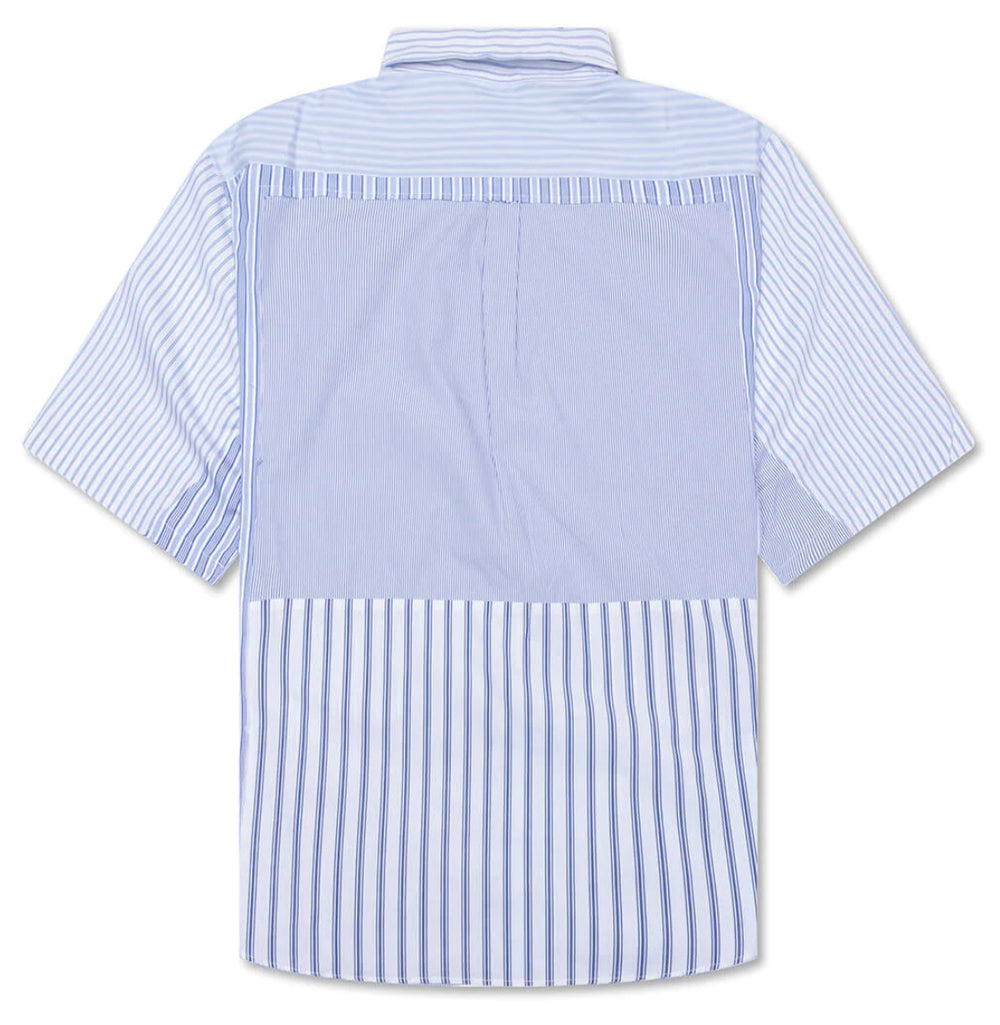 The Market “Blythe” SS Button Up puts a fresh spin on a classic wardrobe staple with its multi-stripe patchwork design. Made from lightweight woven cotton, this shirt combines several blue-and-white stripe patterns for a clean yet visually striking look. The short-sleeve silhouette and button-down collar keep it crisp and versatile, making it easy to dress up or down.