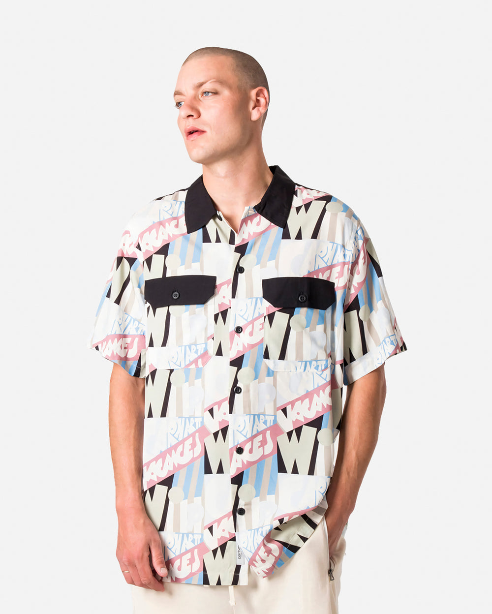 It features a Cuban collar, contrasting black shoulder panels and chest pockets, and front button closure. The relaxed silhouette ensures a laid-back yet structured fit that captures Carhartt WIP’s modern take on vintage workwear.