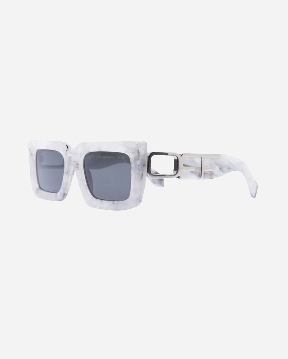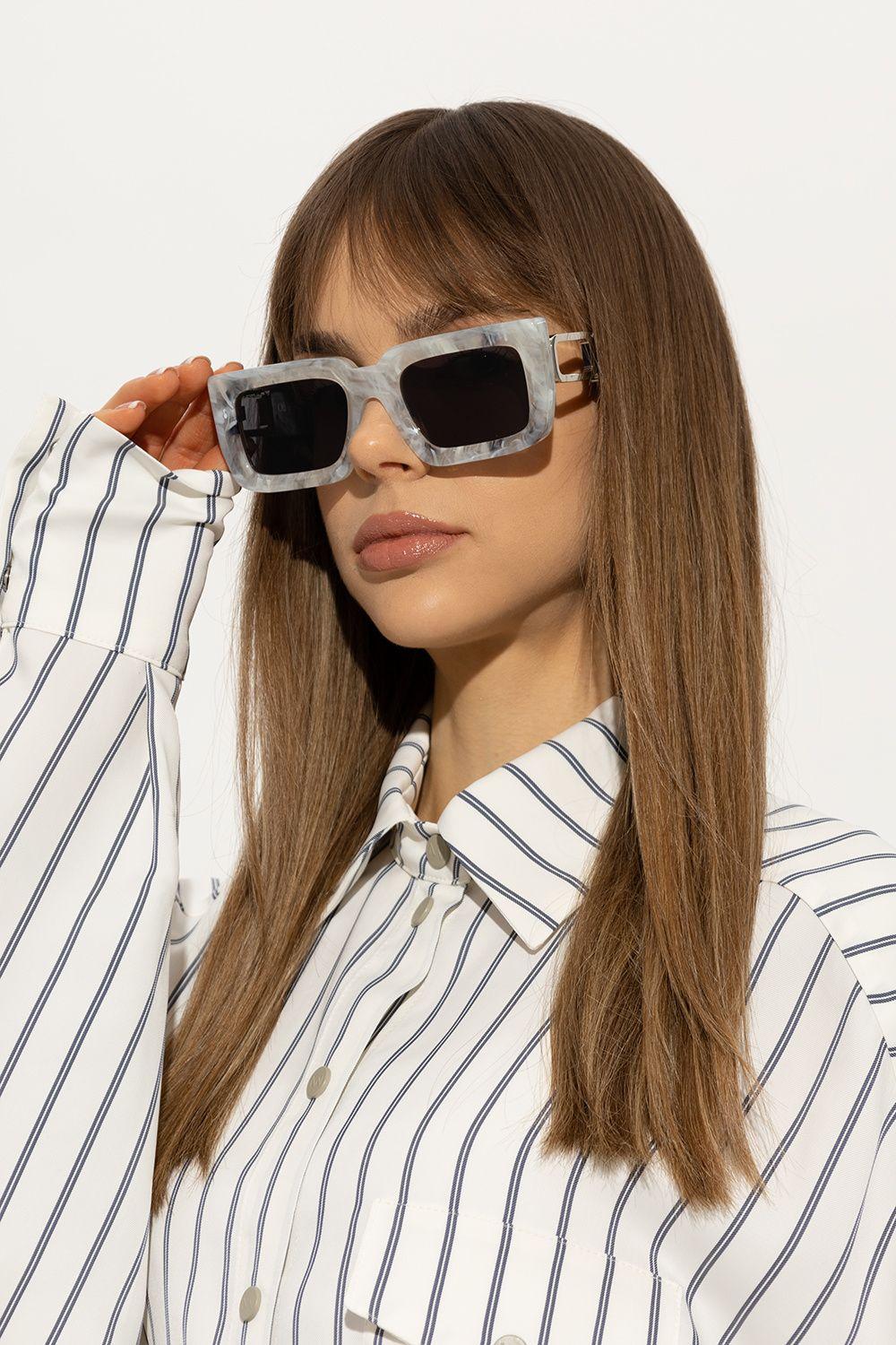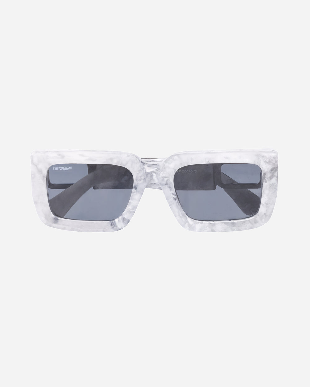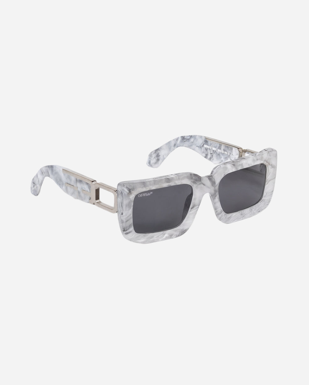 Estas gafas de sol de Off-White tienen una atrevida forma rectangular y se reconocen por las letras doradas del logotipo en la patilla. Fabricadas en Italia. Gafas de sol con montura rectangular Boston de OFF-WHITE con montura rectangular de acetato en color gris, diseño jaspeado, cristales tintados en azul, placa plateada con el logotipo, patillas rectas y puntas curvadas.
