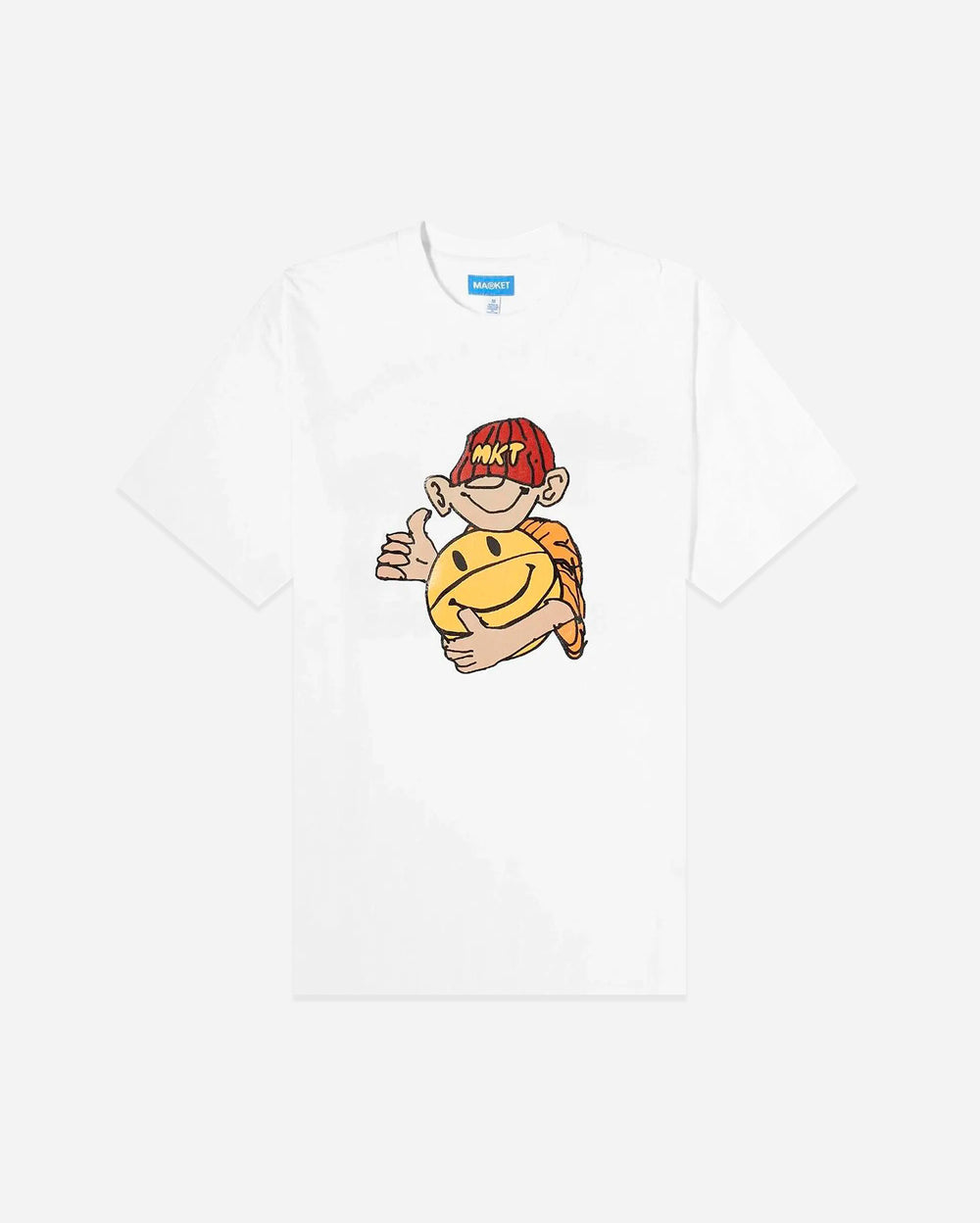 Add a playful edge to your everyday look with the Market Smiley Hug Tee. This white T-shirt features a bold, cartoon-style graphic of a character hugging a large yellow smiley face—an iconic Market touch that blends humor, nostalgia, and streetwear attitude.