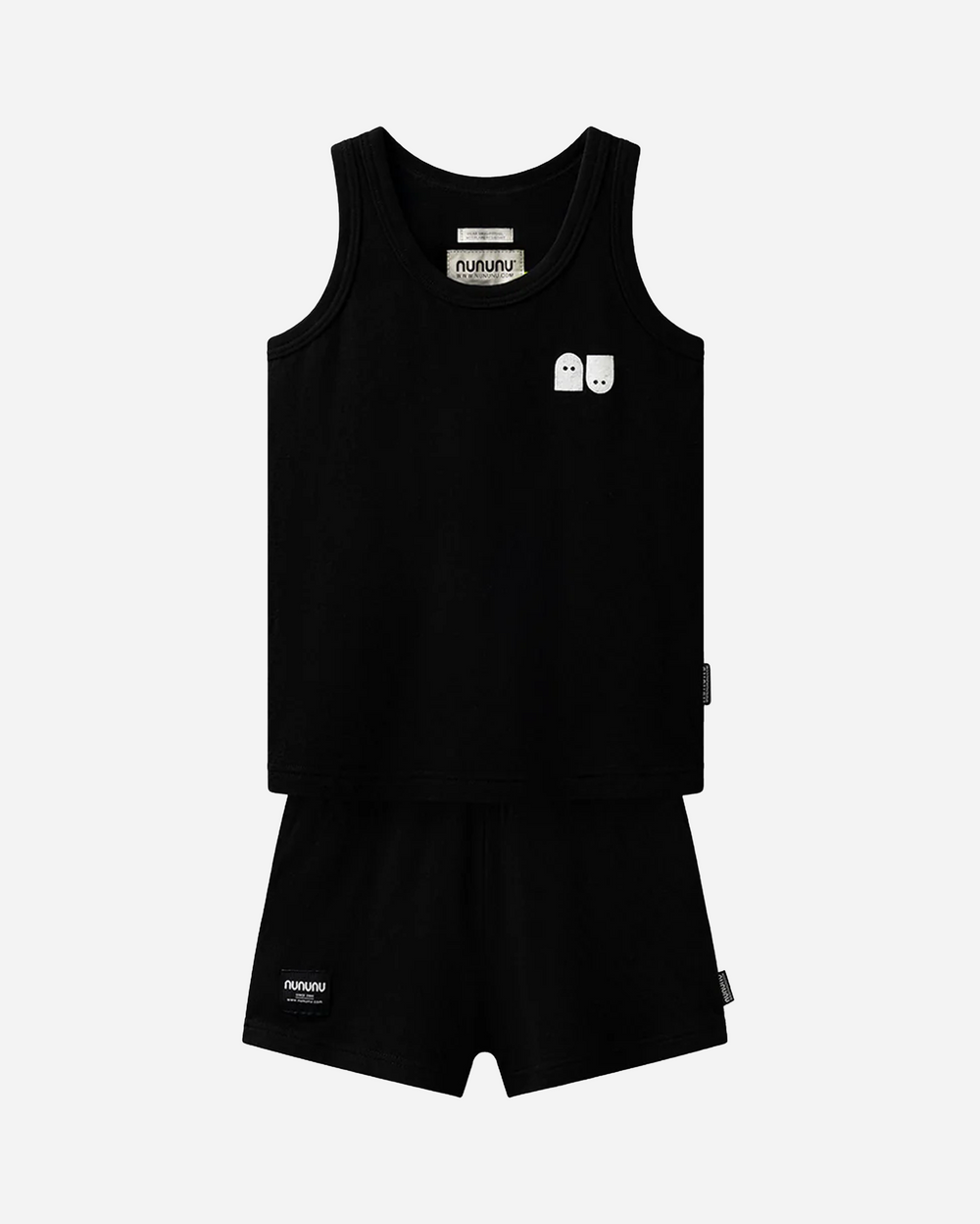 Made from double single cotton, the set features a relaxed fit and breathable softness that keeps kids cool and cozy. The black tank top is adorned with Nununu’s signature “little spookies” floating across the chest, adding a mischievous vibe. Side pockets and a soft waistband on the shorts ensure practical comfort, while the external tag and infused scent reinforce the brand’s unmistakable identity.