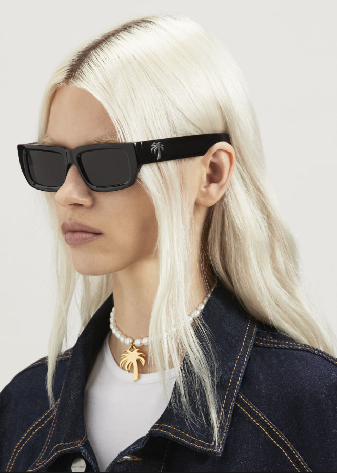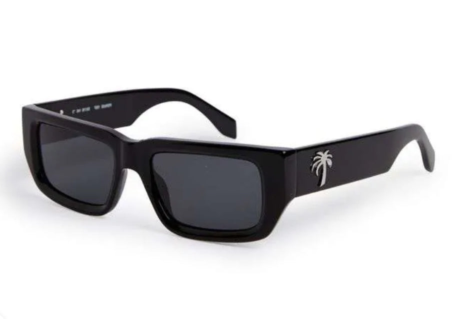 The glossy black frame is paired with dark lenses for a sleek, monochromatic look—finished with the iconic Palm Angels palm tree emblem in metallic detail at the temples. Minimalist, luxurious, and instantly recognizable, this pair is built to elevate any fit, from streetwear uniforms to beach-city essentials.
