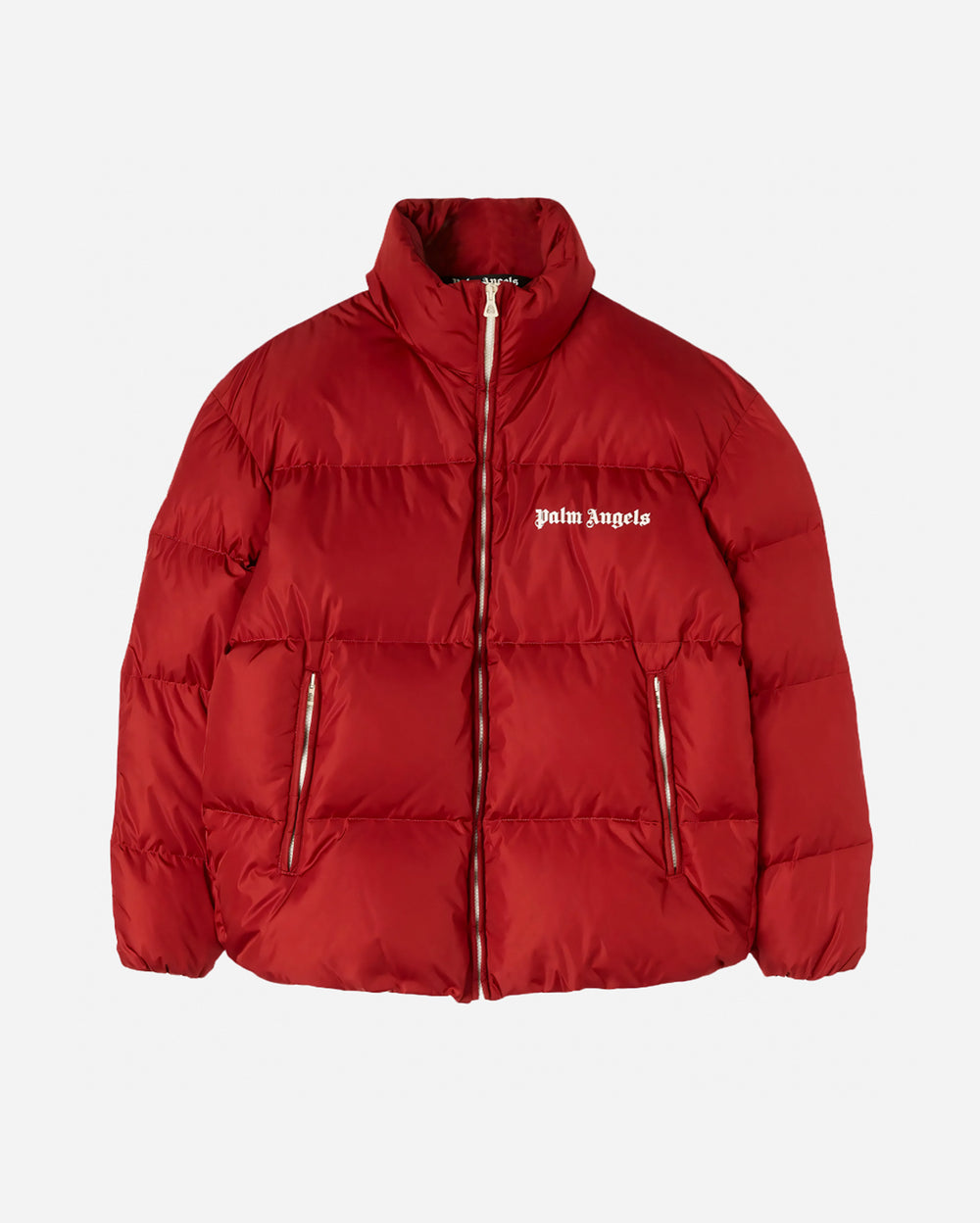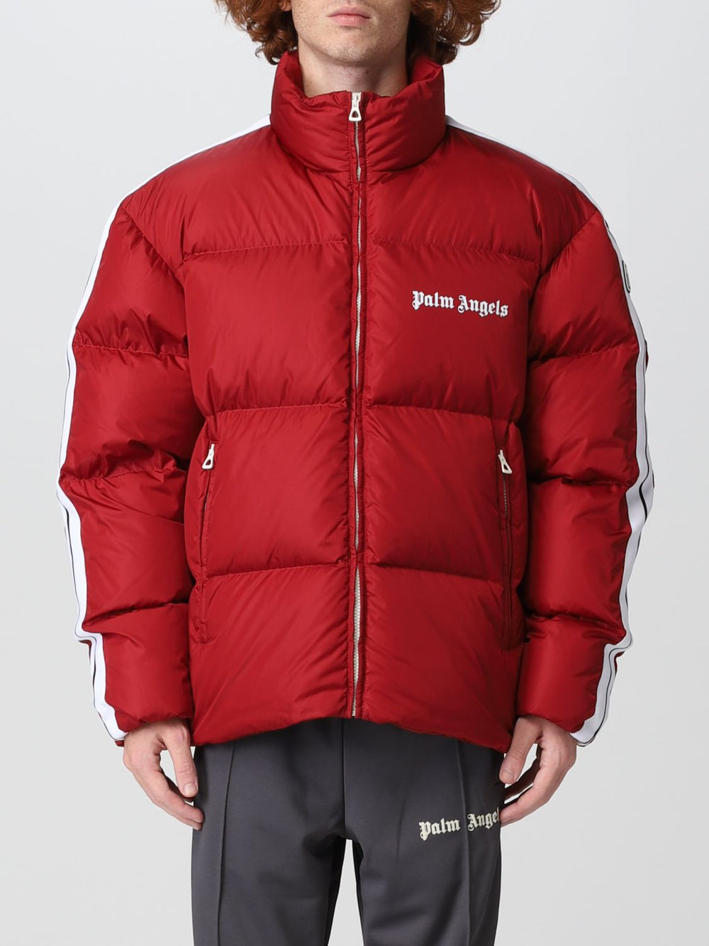 CHAQUETA DE PLUMAS DE MANGA LARGA EN TEJIDO TÉCNICO ROJO. LOGOTIPO "PALM ANGELS" ESTAMPADO EN BLANCO EN LA PARTE DELANTERA. PARCHE PXP COSIDO EN EL LATERAL. CIERRE Y BOLSILLOS CON CREMALLERA. RAYAS BLANCAS EN LAS MANGAS. AJUSTE REGULAR.