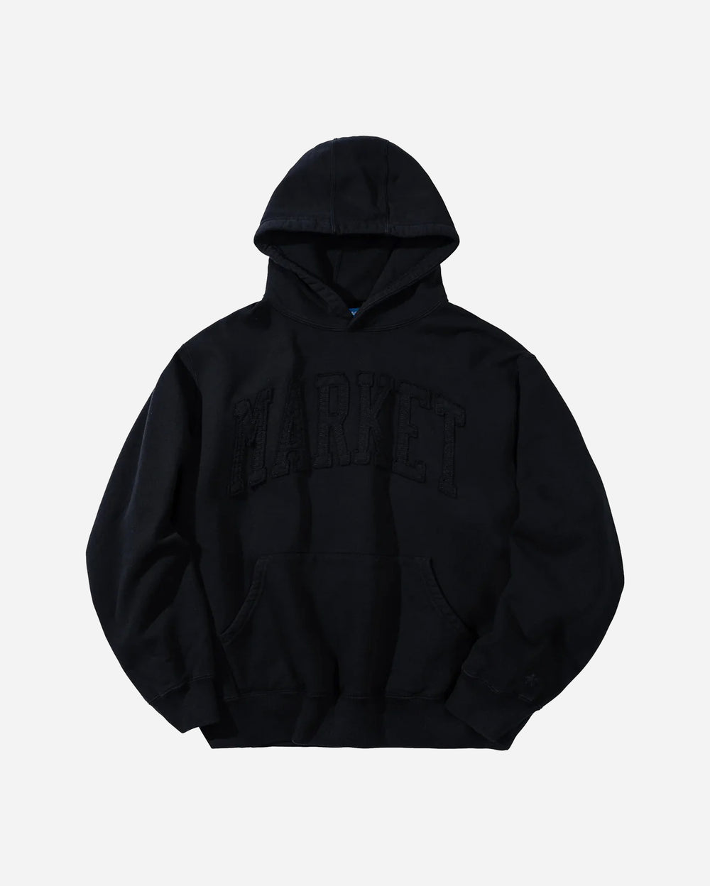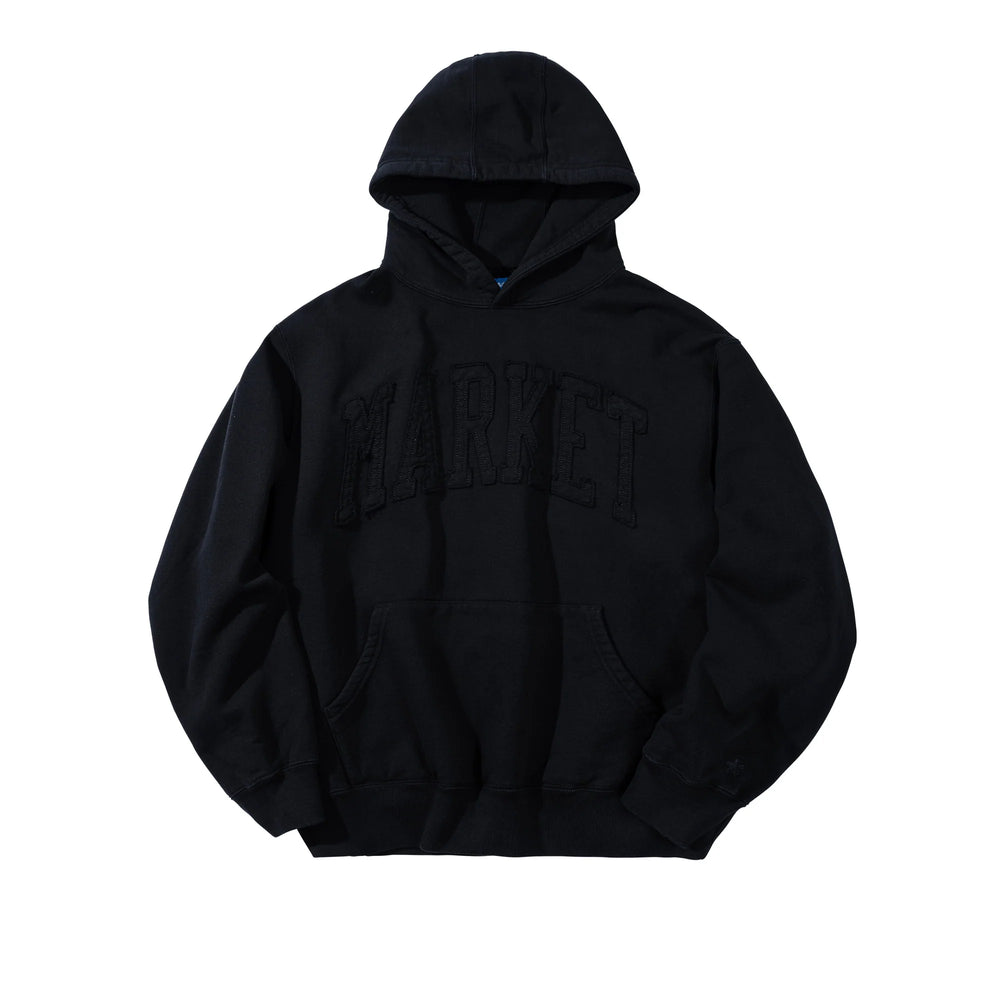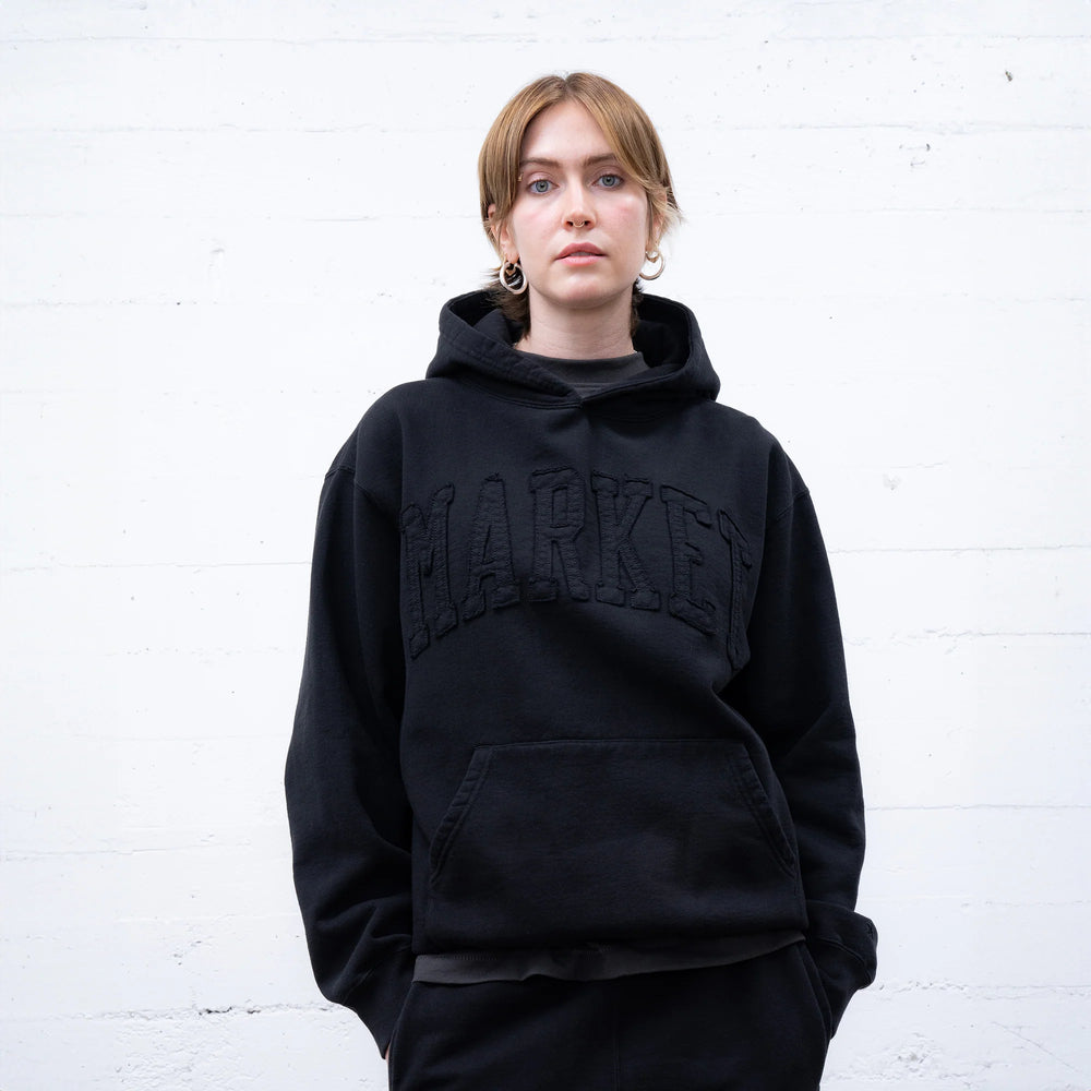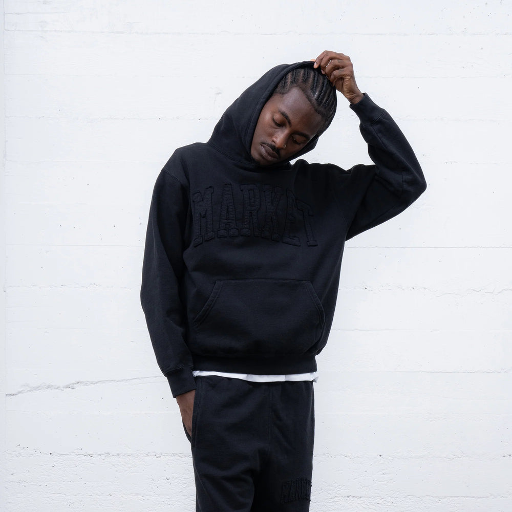 The Market Washed Arc Hoodie brings a clean yet bold aesthetic with its monochrome, tonal design. Crafted in a deep black wash, this hoodie features an arched MARKET appliqué across the chest, subtly stitched in matching black for a sleek, low-profile look.