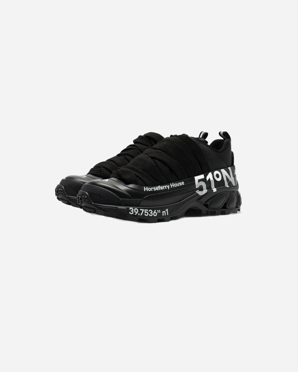 Zapatos deportivos bajas de piel de becerro revestida en negro. Texto estampado en blanco. Cierre de cordones modificado.