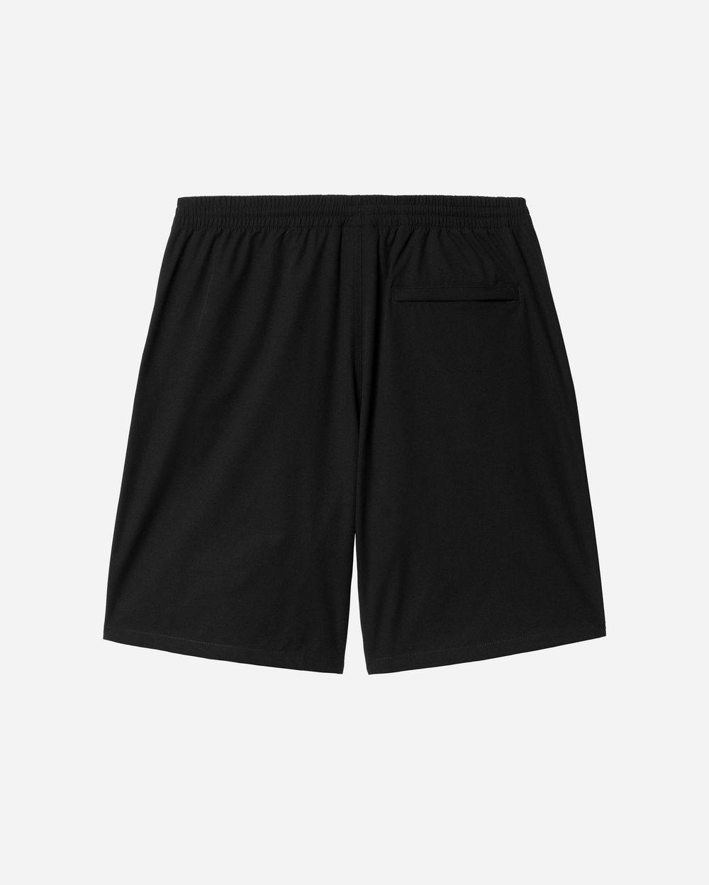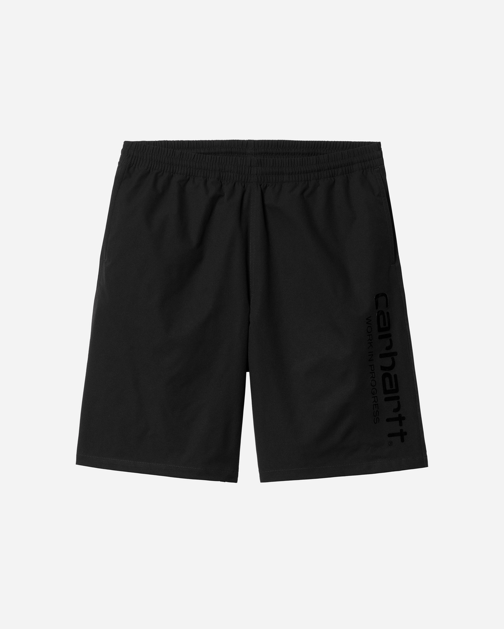 They feature an elastic waistband with adjustable drawstring, two side pockets, and a back pocket with Velcro closure for secure storage. The tonal Carhartt WIP logo print along the left leg adds a subtle branded finish, combining durability with a clean, minimal design.