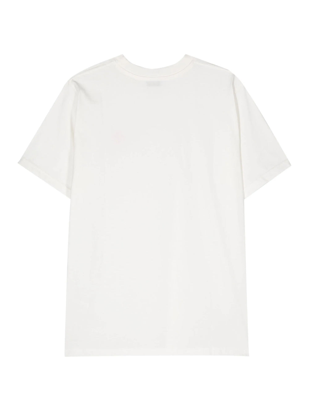 Esta camiseta de algodón, fabricada en Italia, destaca por su color blanco y su textura de jersey. Presenta un cuello redondo, un logo bordado en el pecho, mangas cortas y un bajo recto. Composición: 100% Algodón. Instrucciones de lavado: Lavar a máquina