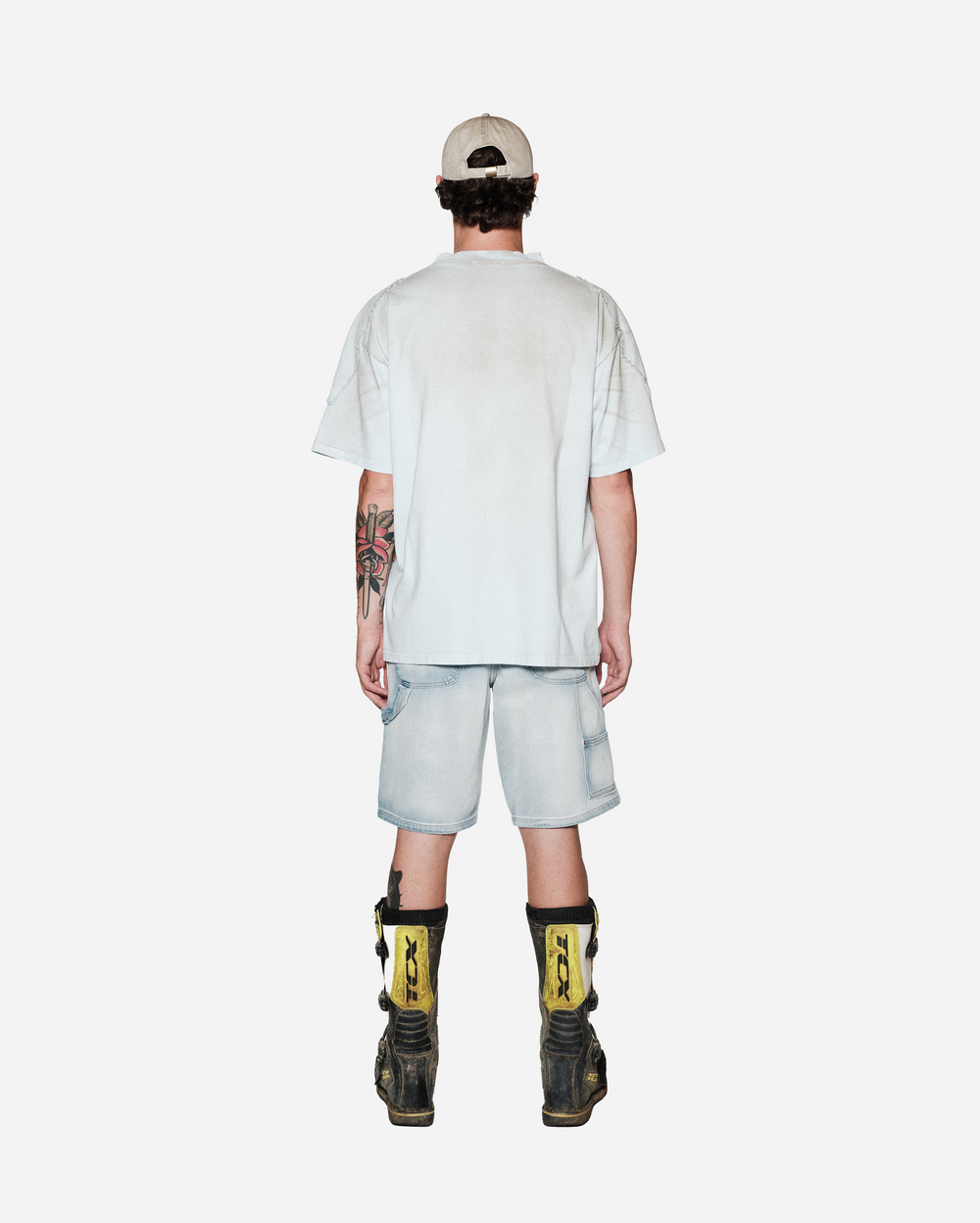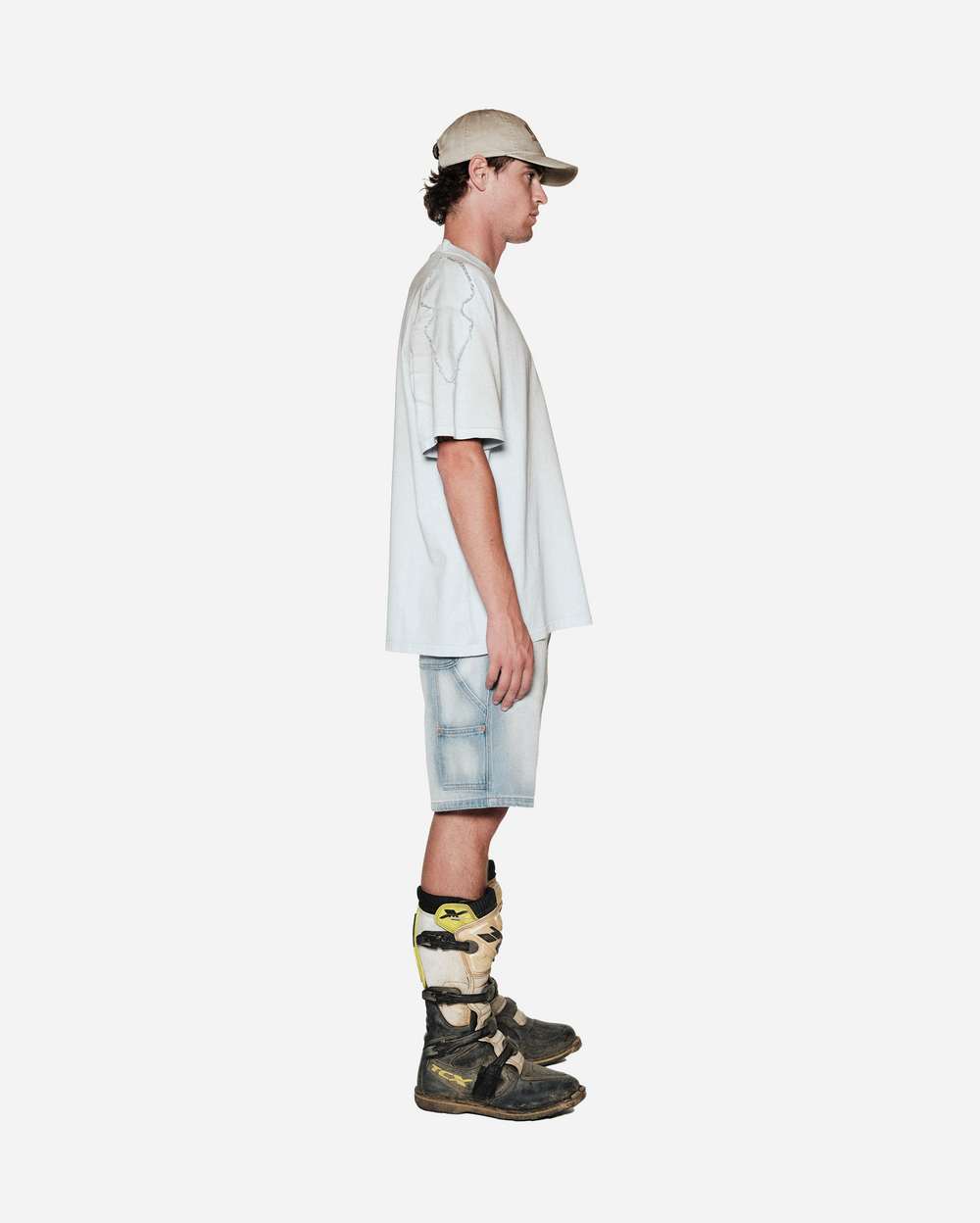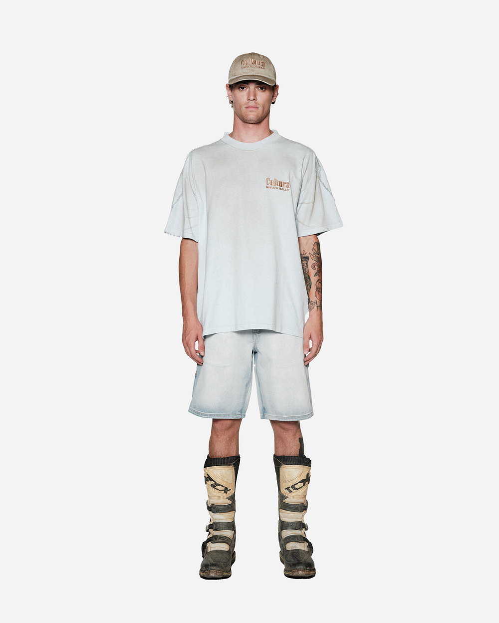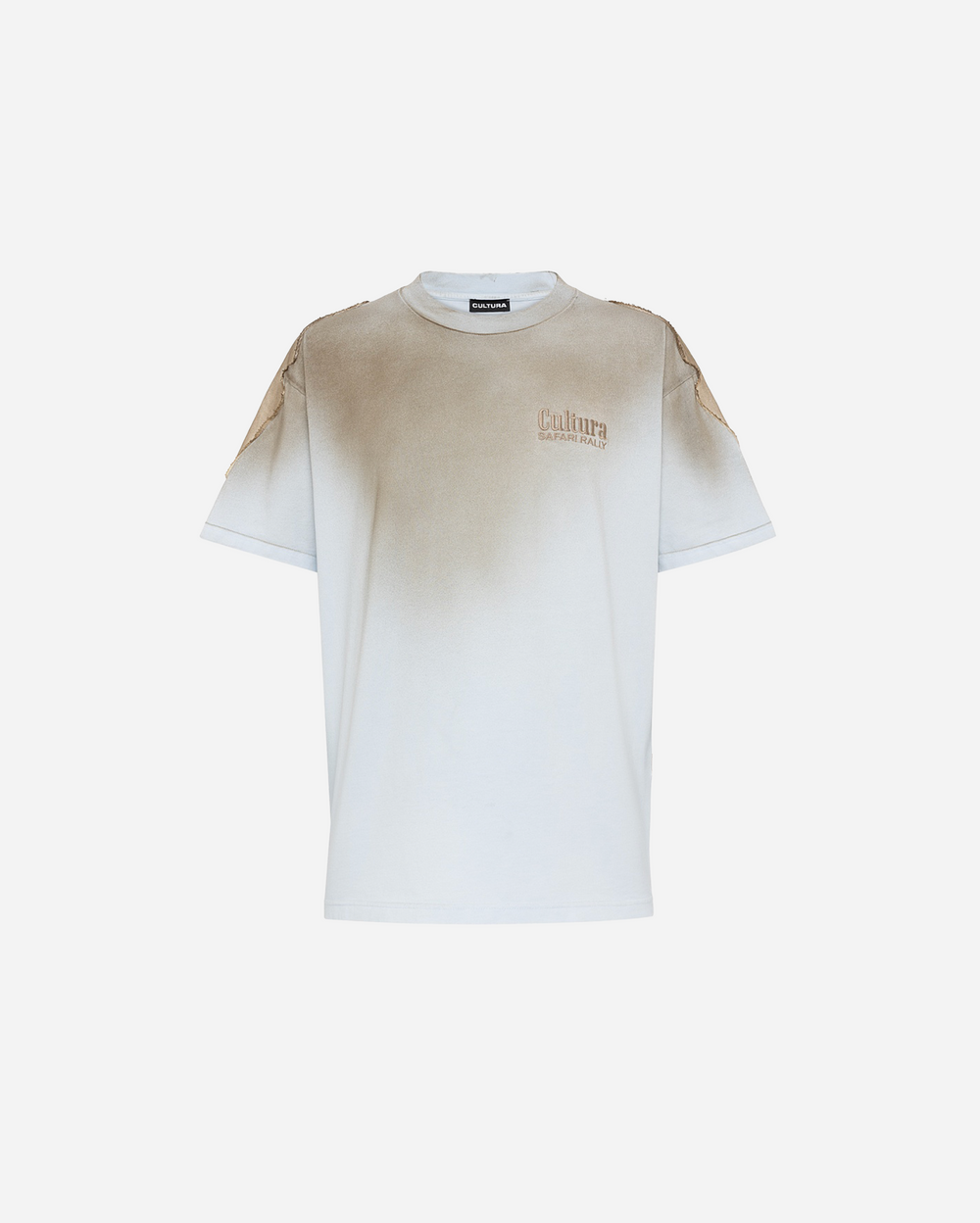 This tee is designed with a rugged, desert-inspired aesthetic that captures the essence of off-road culture. The upper half features a dust-washed gradient effect that gives it a naturally weathered look, as if worn on a real rally trail.