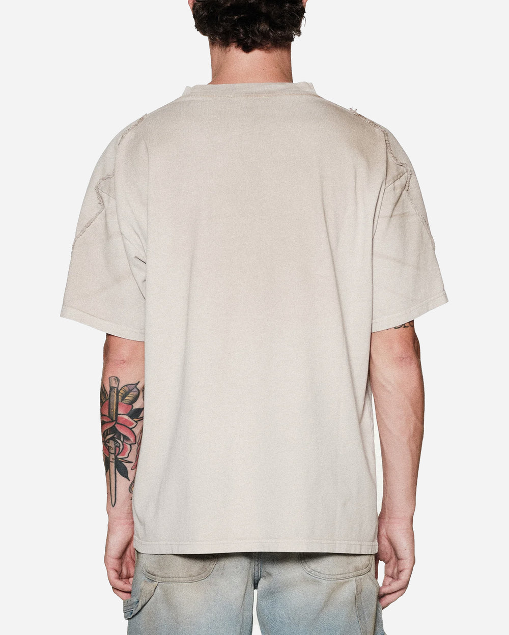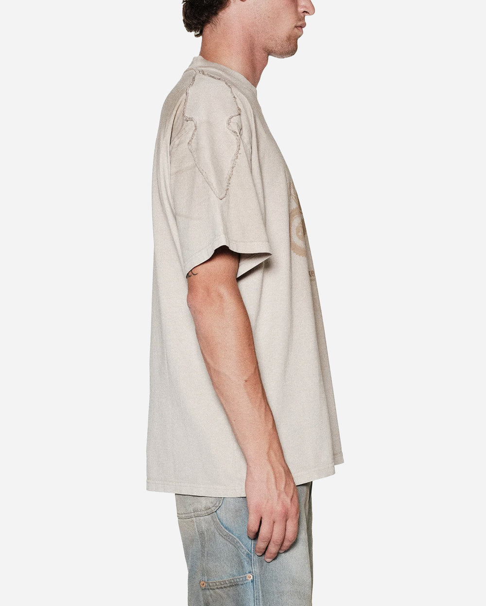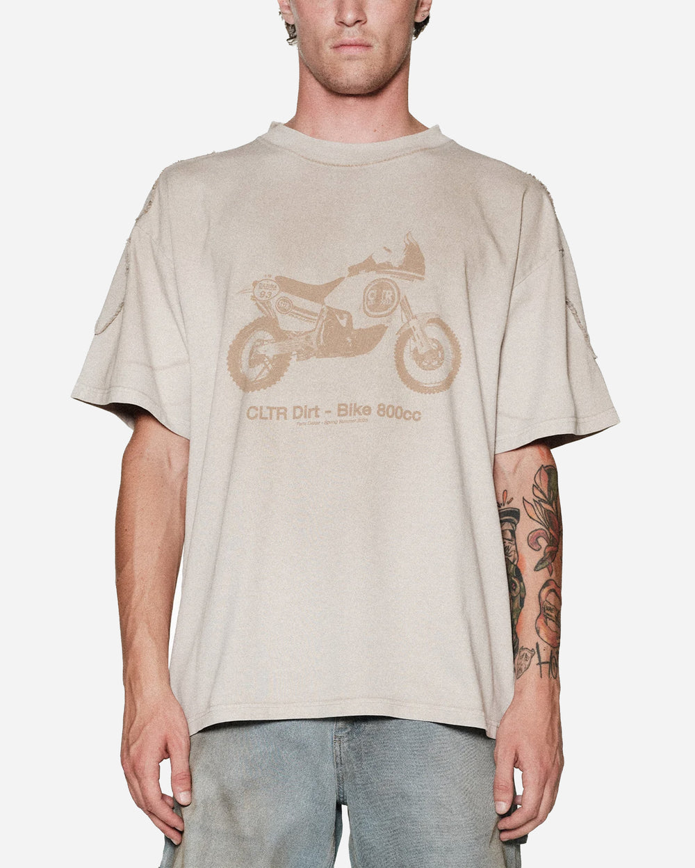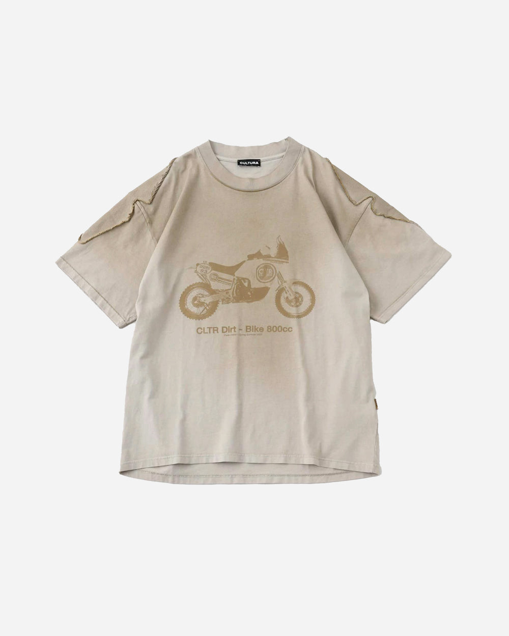 The Biker T-Shirt embodies raw off-road attitude with a bold dirt-bike graphic front and center. Designed in a washed sand tone, it carries a sun-worn, desert-ready aesthetic that fits perfectly within rally and motocross culture. Distressed panel details on the sleeves add texture and a custom-built feel, giving the piece a rugged edge.