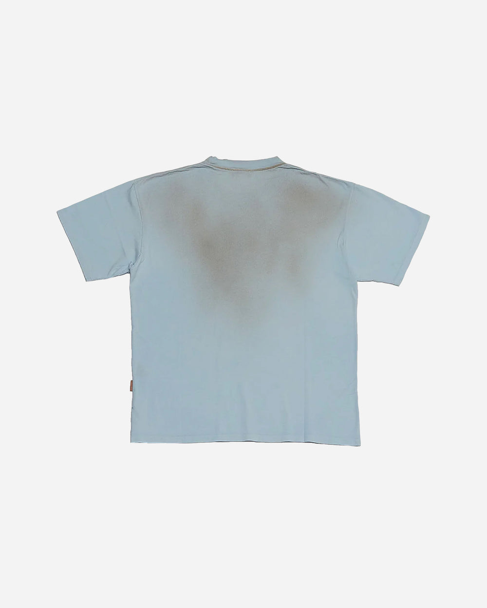 Light, sun-washed blue tone with sand-dust effect on the chest