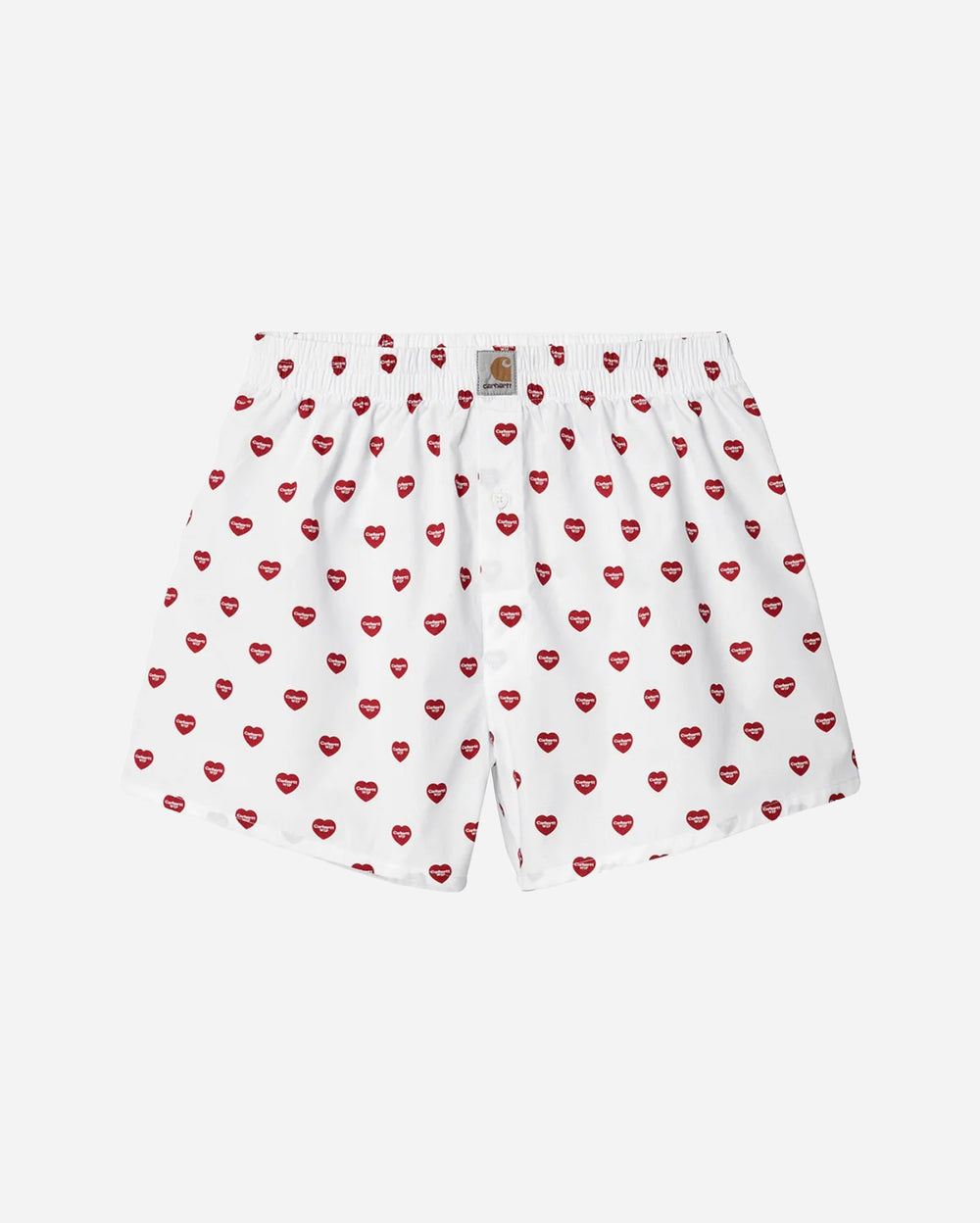They feature an all-over red heart print with the Carhartt logo at the center of each motif, a comfortable elastic waistband, and a button fly. The woven Carhartt patch on the waistband completes the look with an authentic workwear touch.