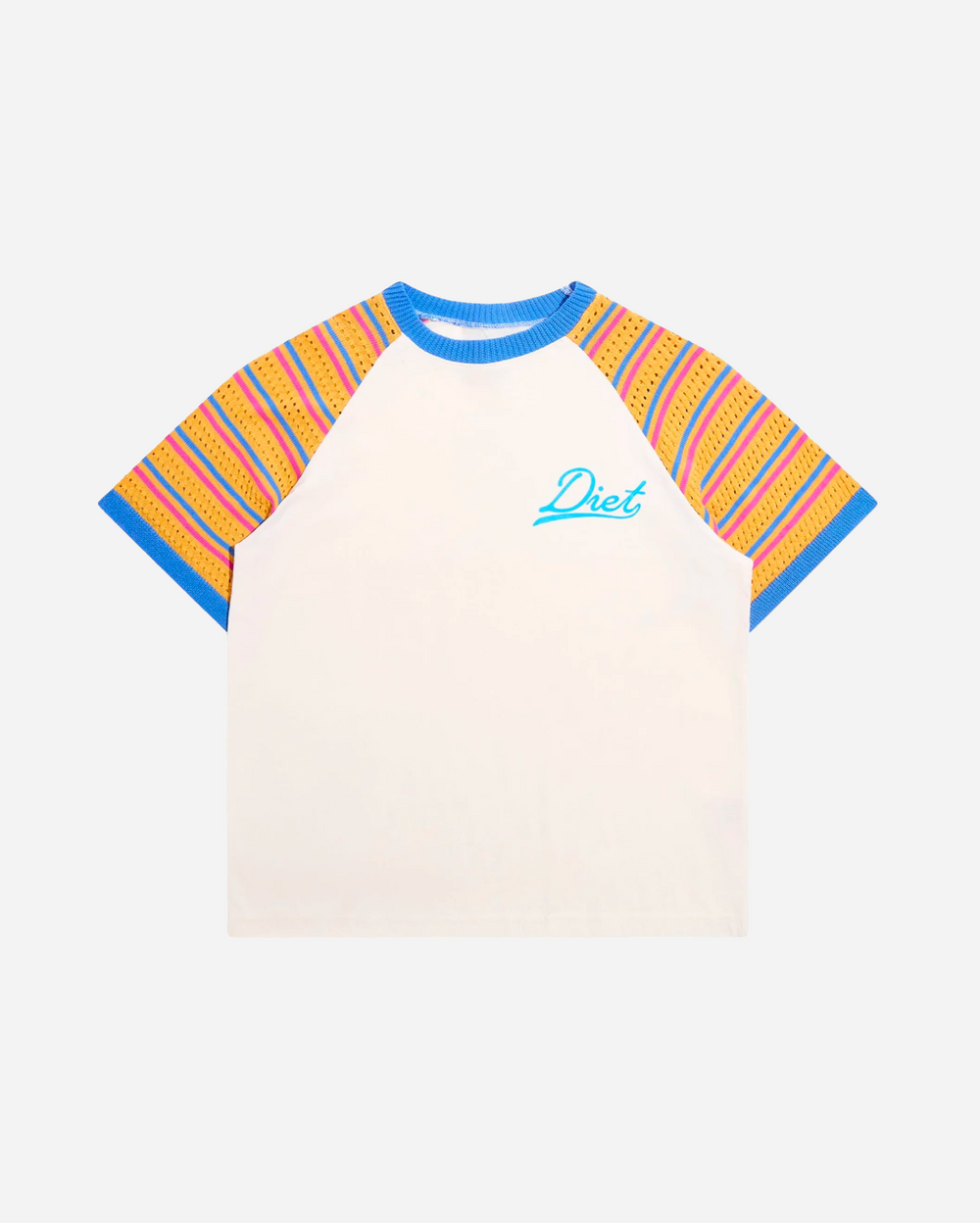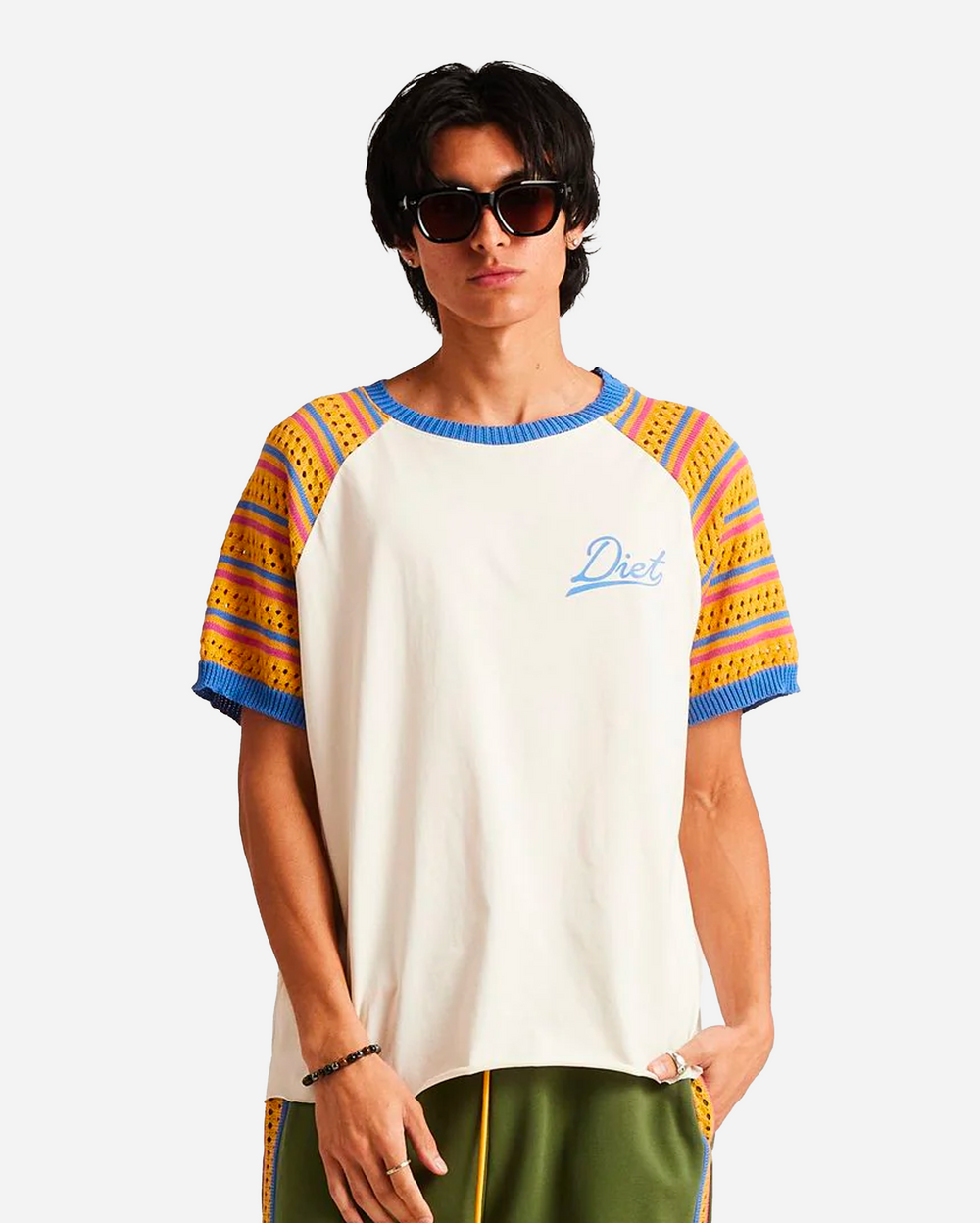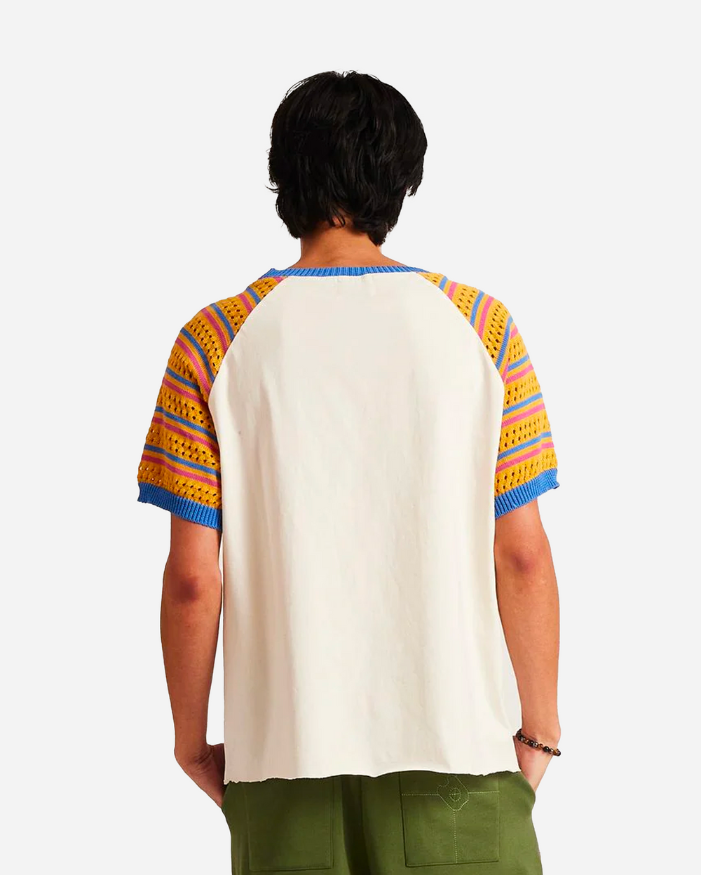 A standout warm-weather essential that blends playful texture with easy everyday wear. This Cream/Yellow raglan tee features custom crochet sleeves that bring color, dimension, and a handcrafted feel to a clean cream body.