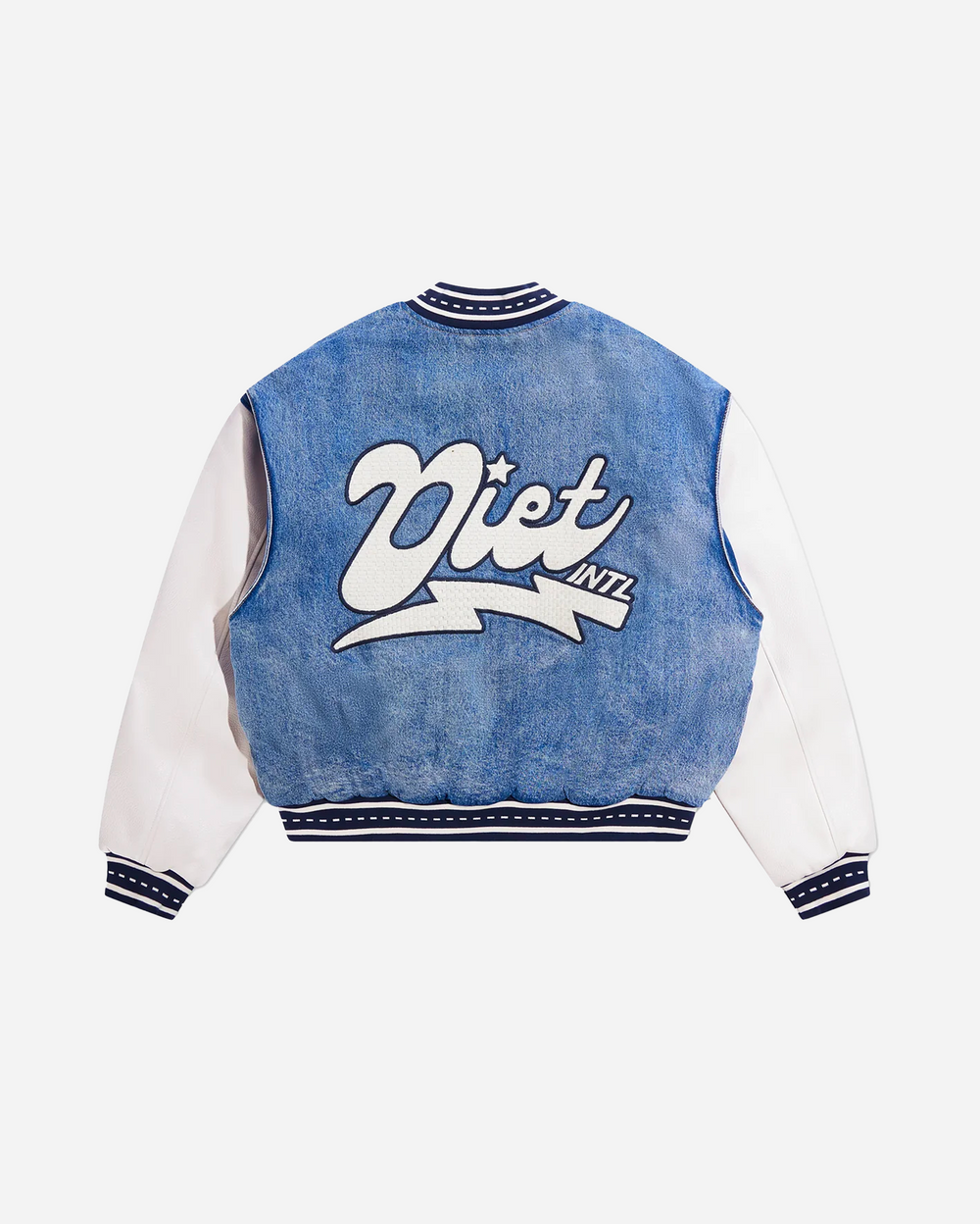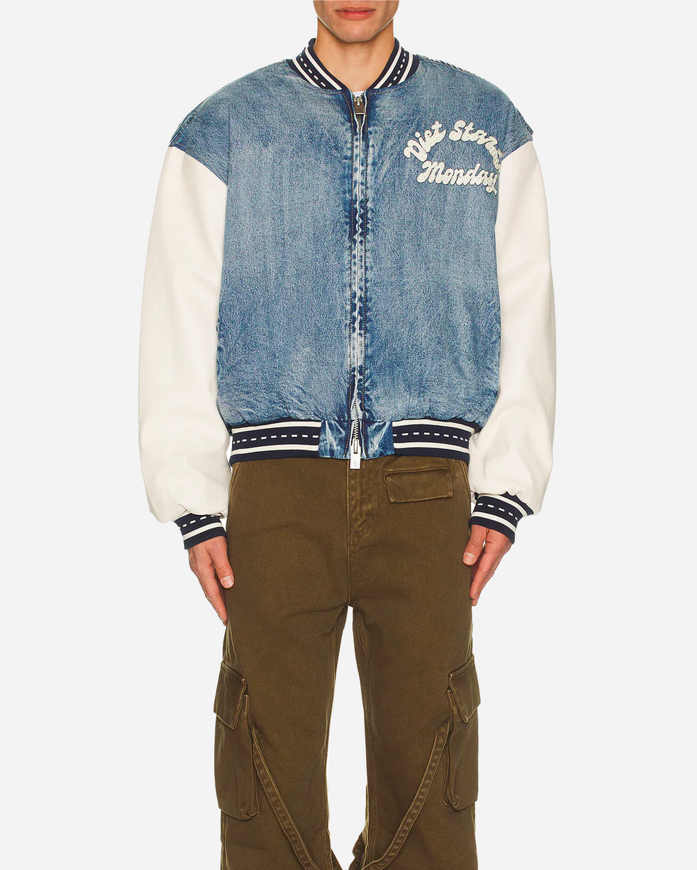 A standout layering piece that blends vintage athletic styling with a modern, elevated finish. The Denim Bomber in Washed Indigo/Cream brings together a soft, worn-in denim body with clean cream sleeves, creating a bold and versatile look that works across seasons.