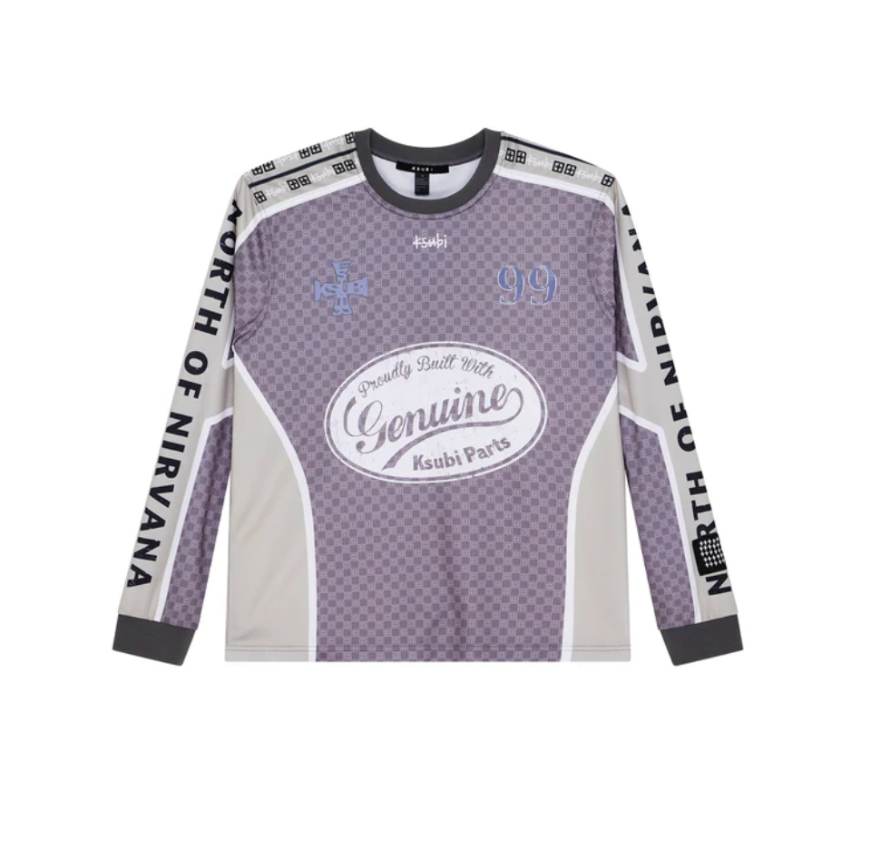 The Garage LS Moto Jersey Moss Black is a regular fitting, moto-inspired jersey with long sleeves, ribbed sleeve cuffs, and a ribbed neckline. Cut from a technical moto jersey fabric, it features engineered digitally printed artwork placements and is finished with signature T-box and 4x4 branding, along with a Ksubi sleeve tag detail.