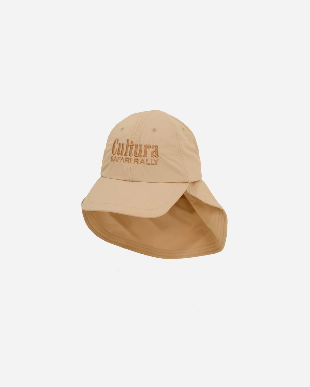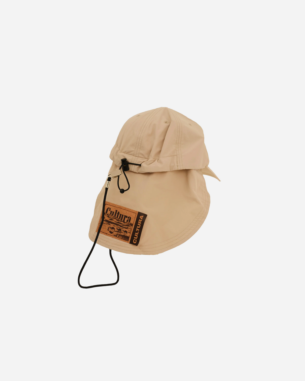 The Safari 5 Panel Hat by Cultura blends outdoor functionality with a clean, utilitarian aesthetic. Designed in a sand-beige tone, this hat features a classic front brim along with a protective rear flap to shield the neck from intense sunlight—perfect for outdoor environments.