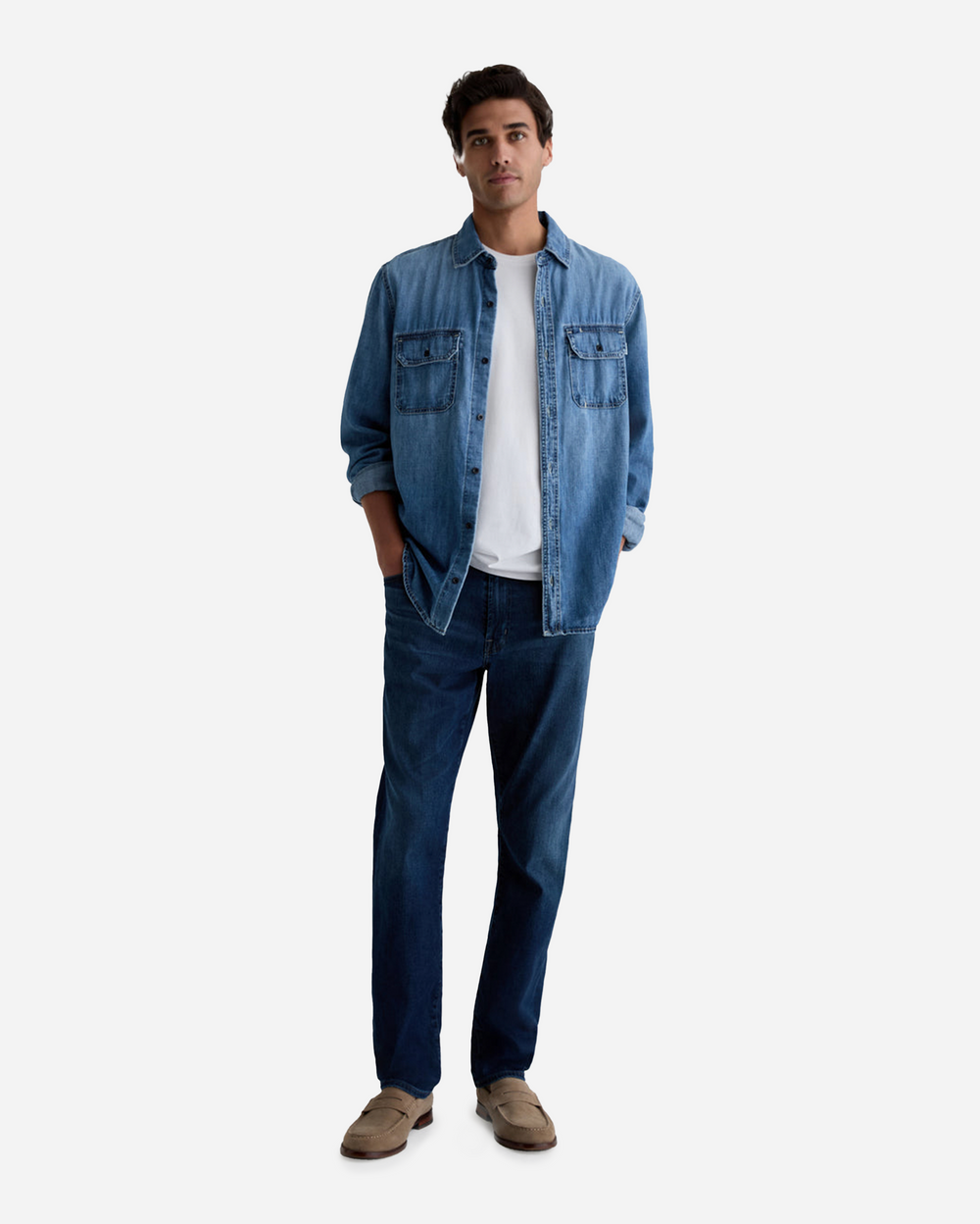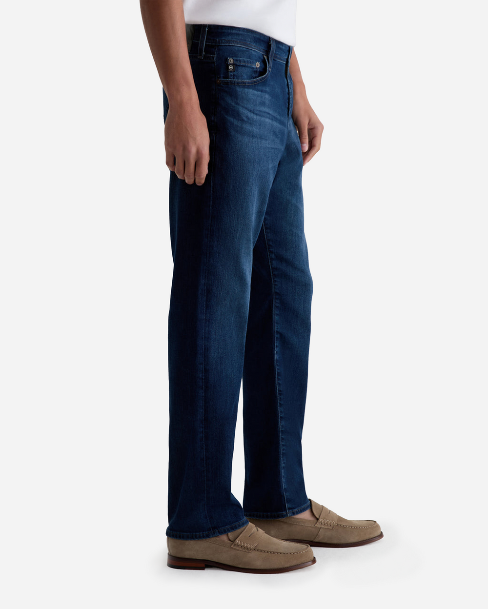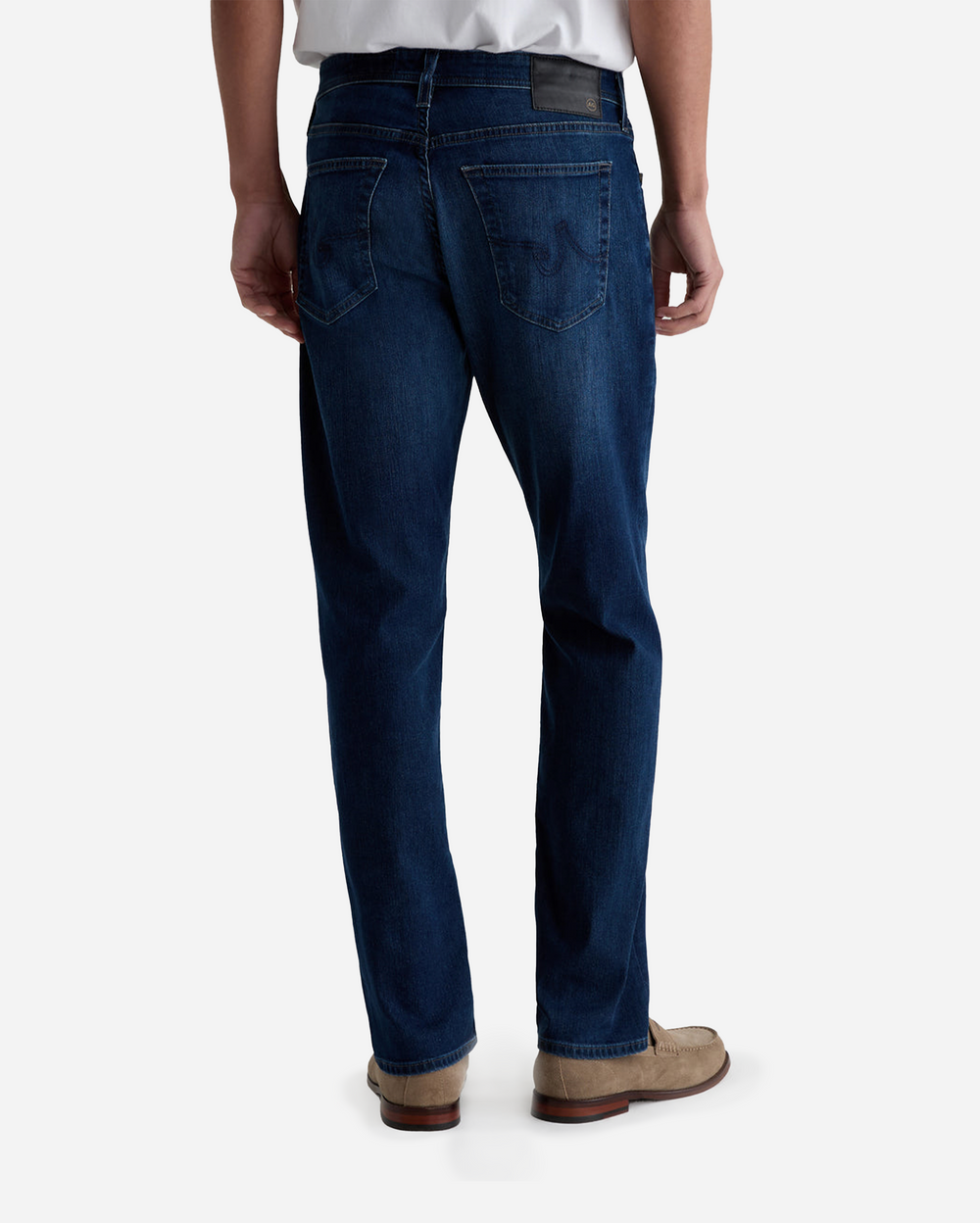 Everett es un corte recto ajustado para hombre, que se presenta aquí en un lavado índigo profundo con desgaste y arrugas (fading and whiskering). El modelo tiene una cintura de tiro medio y un corte recto que es relajado desde la cadera hasta la rodilla antes de estrecharse ligeramente en la abertura de la pierna. Estos jeans slim straight para hombre están confeccionados en denim de nailon Aerial Airluxe™ de 9 oz., que está mezclado con tejido elástico cómodo.