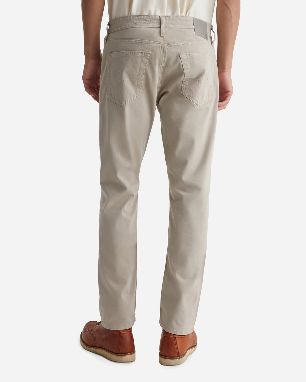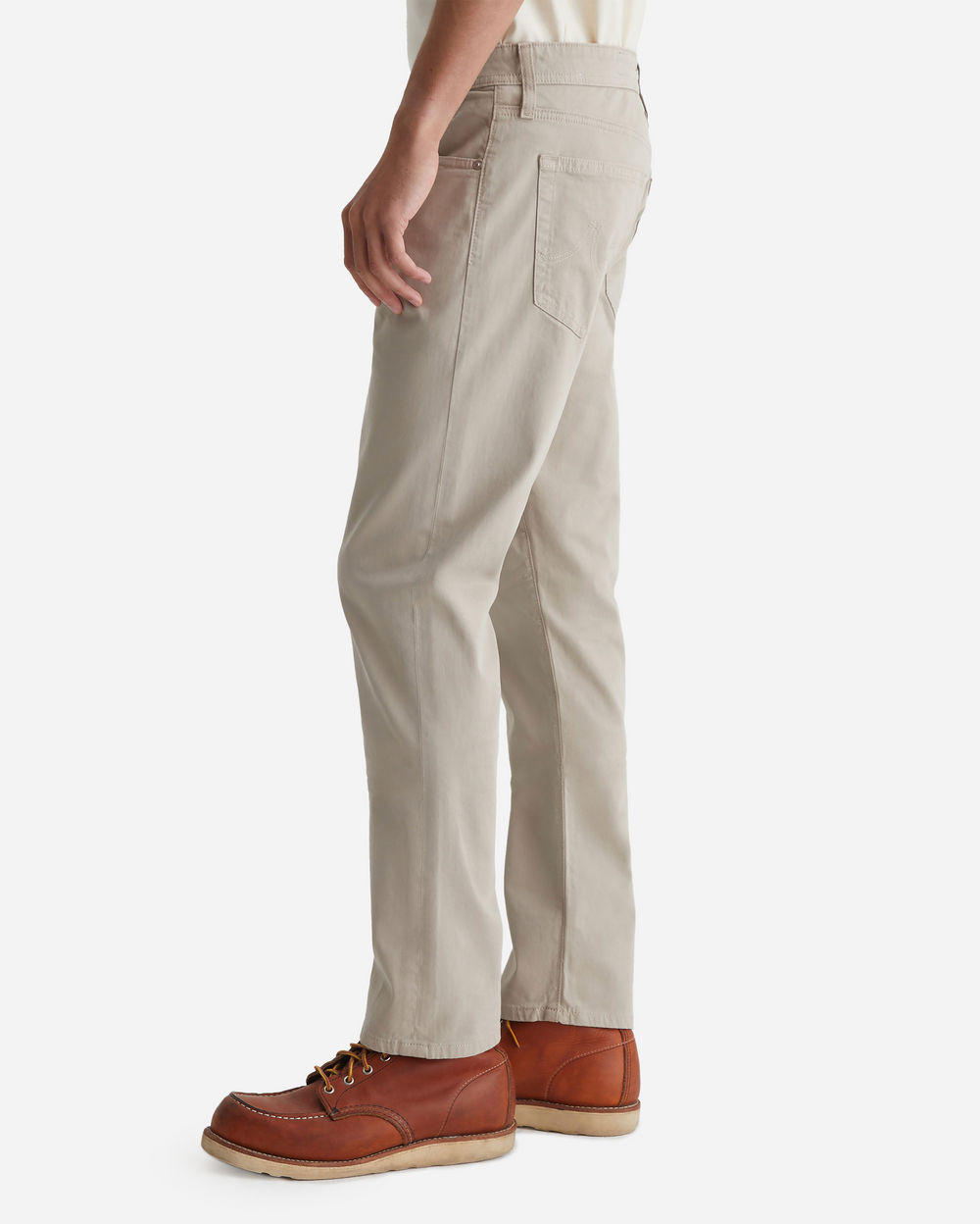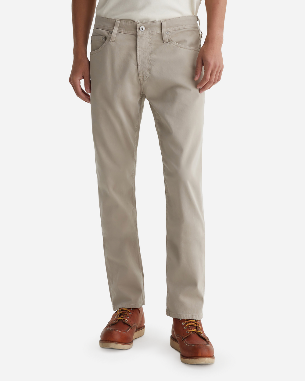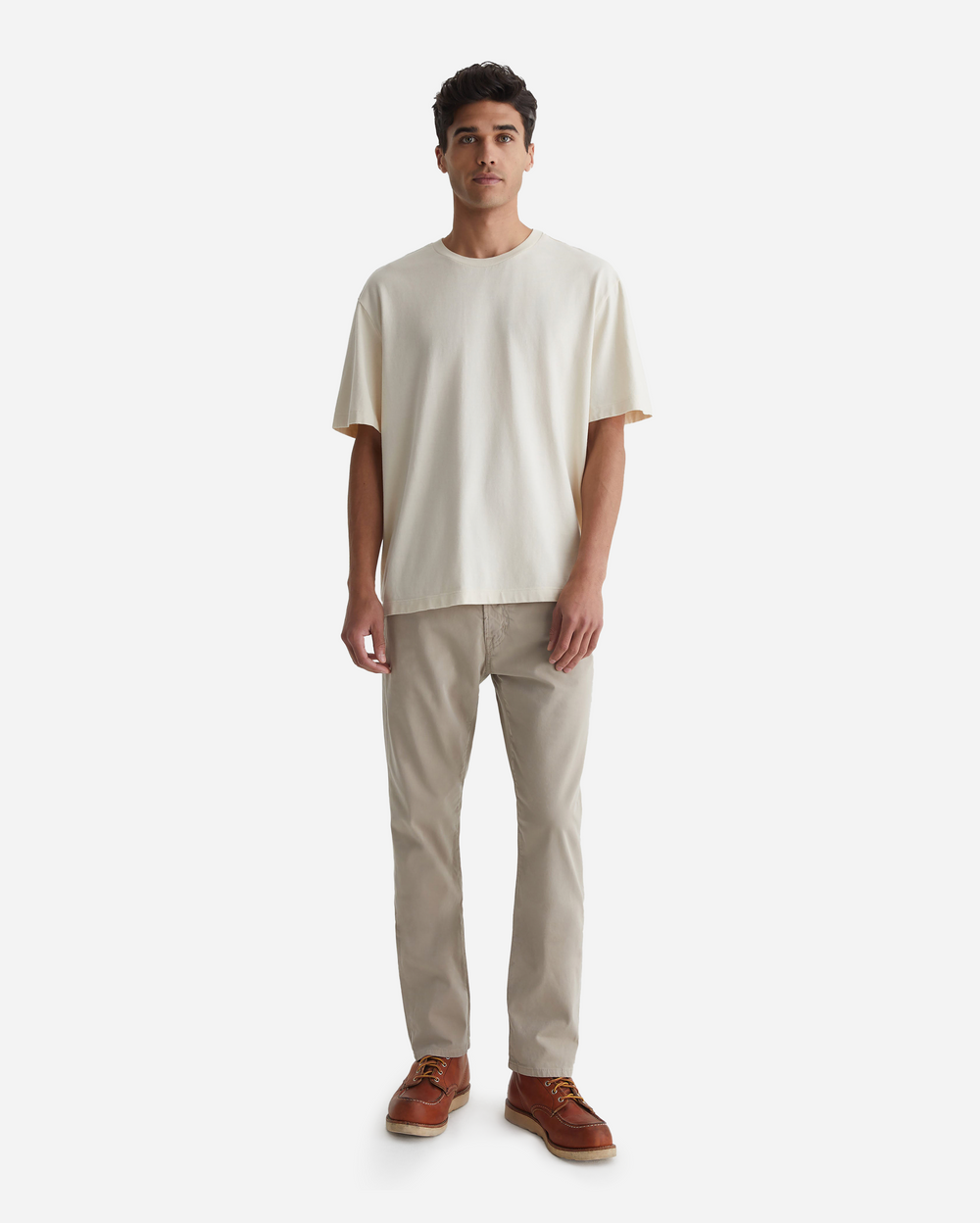 Everett es un jean slim straight para hombre que presenta un tono beige, con un cómodo tiro medio y un corte recto relajado desde la cadera hasta la rodilla antes de estrecharse ligeramente en la abertura de la pierna. Este jean slim straight para hombre está diseñado en sarga elástica aterciopelada (Sueded Stretch Sateen) de 8.4 oz.