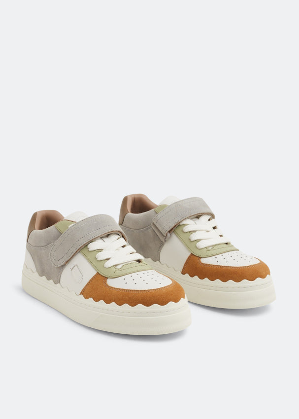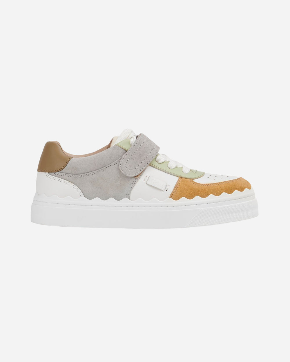 The Lauren Sneakers stand out with their playful mix of textures and colors, blending modern design with everyday comfort. Crafted in a combination of smooth leather and soft suede, they feature a color-blocked palette of white, grey, mustard, pastel green, and tan. The signature wavy detailing along the sides adds a unique touch, while the adjustable Velcro strap pairs with traditional laces for a secure and customizable fit.