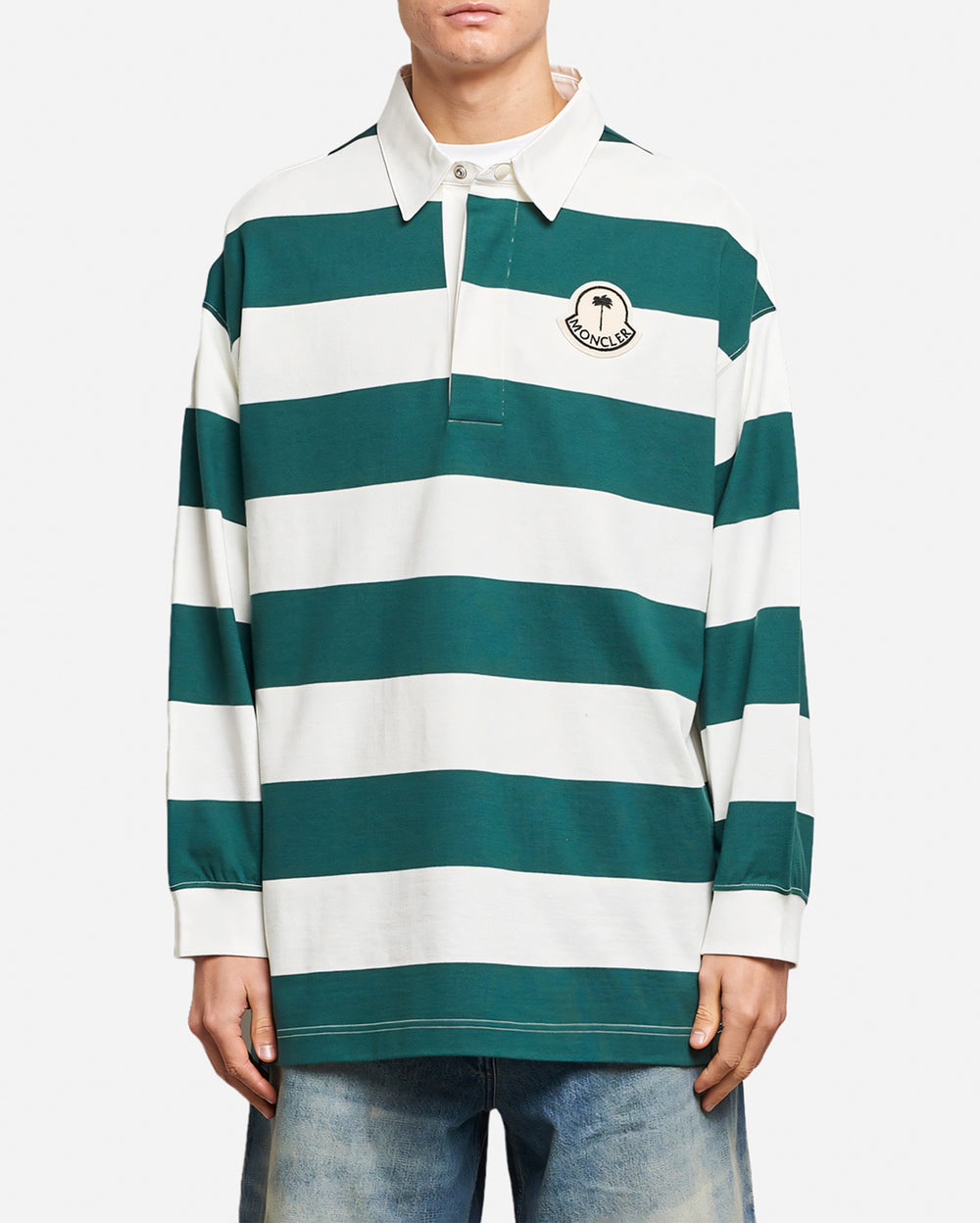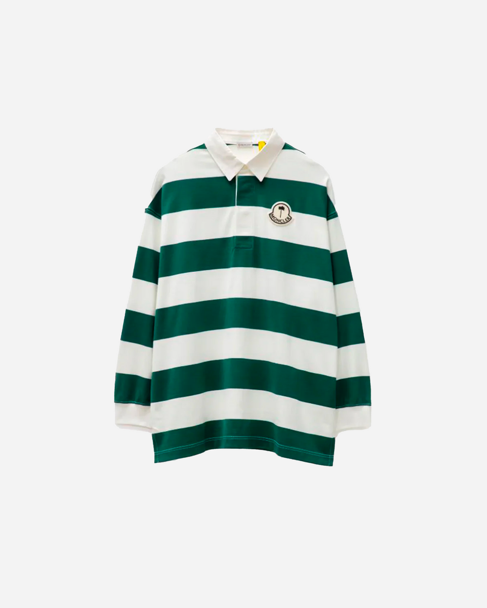 A fresh reinterpretation of the heritage rugby silhouette, the Moncler Striped Rugby Polo blends sport-inspired design with the brand’s refined Alpine attitude. Crafted from heavyweight cotton jersey, the piece features bold green-and-white horizontal stripes that deliver a clean yet striking visual rhythm. The crisp white collar and concealed button placket give it a polished edge, balancing the relaxed fit with a dose of sophistication.