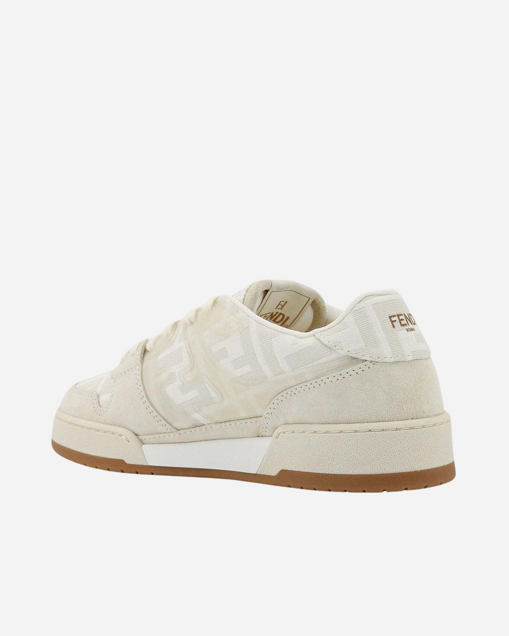 Los zapatos en la imagen son zapatillas deportivas Fendi Match para mujer, confeccionadas en Italia. Se caracterizan por tener detalles en jacquard con el logo FF y aplicaciones de ante. La suela es de goma con plataforma, y el diseño general combina elementos clásicos con un toque moderno.