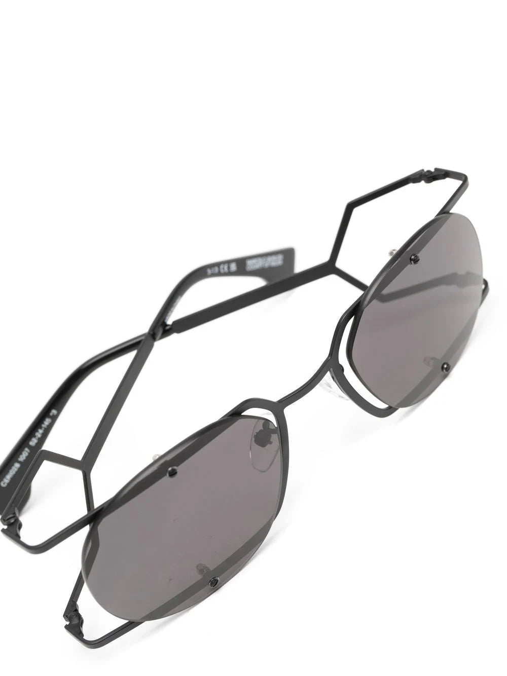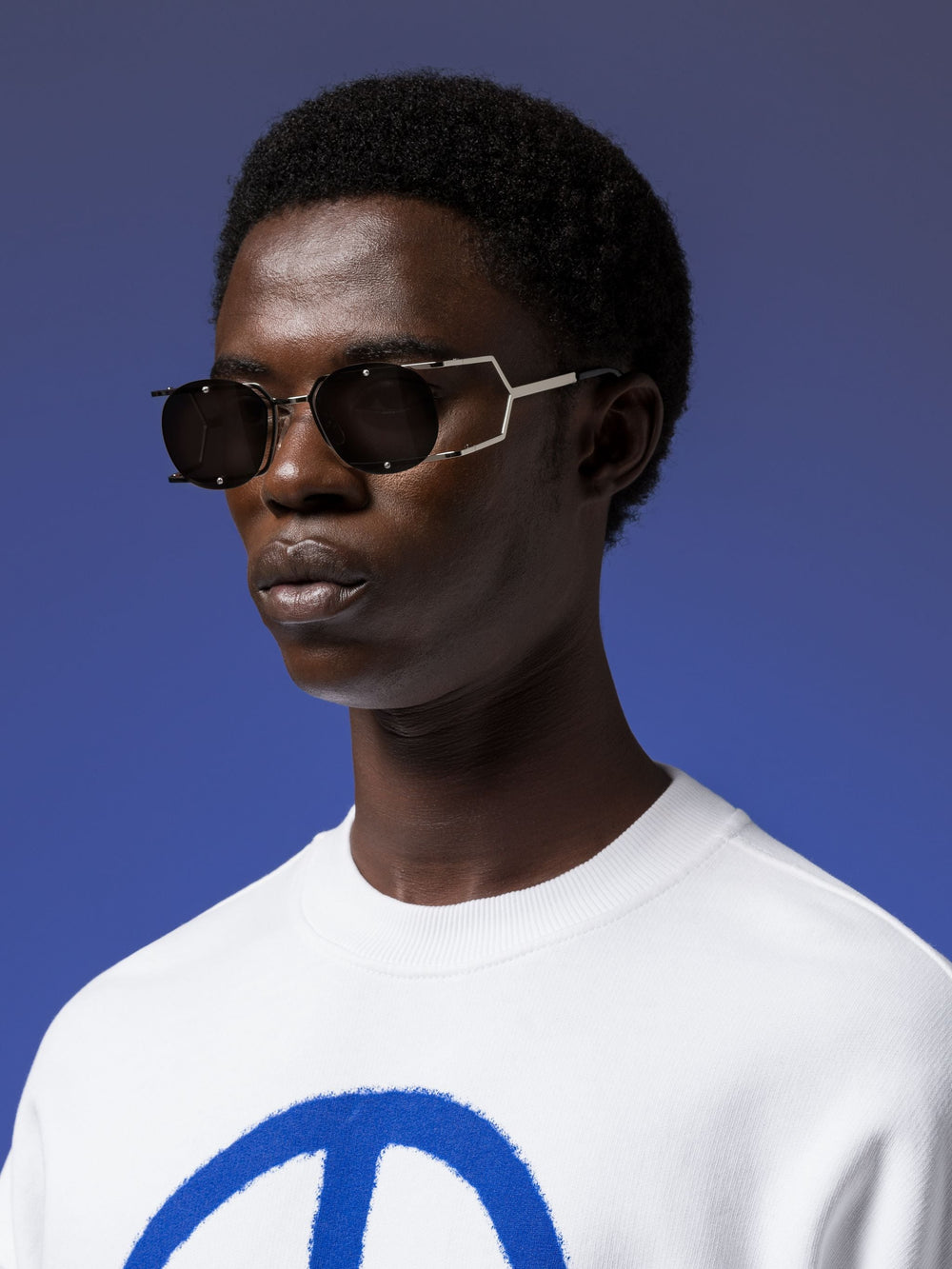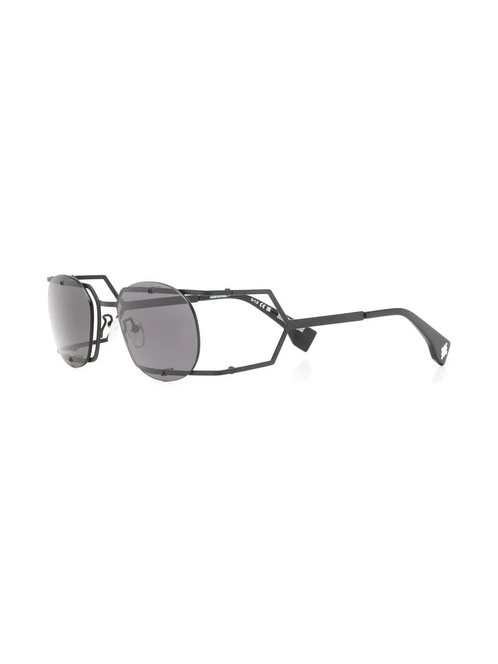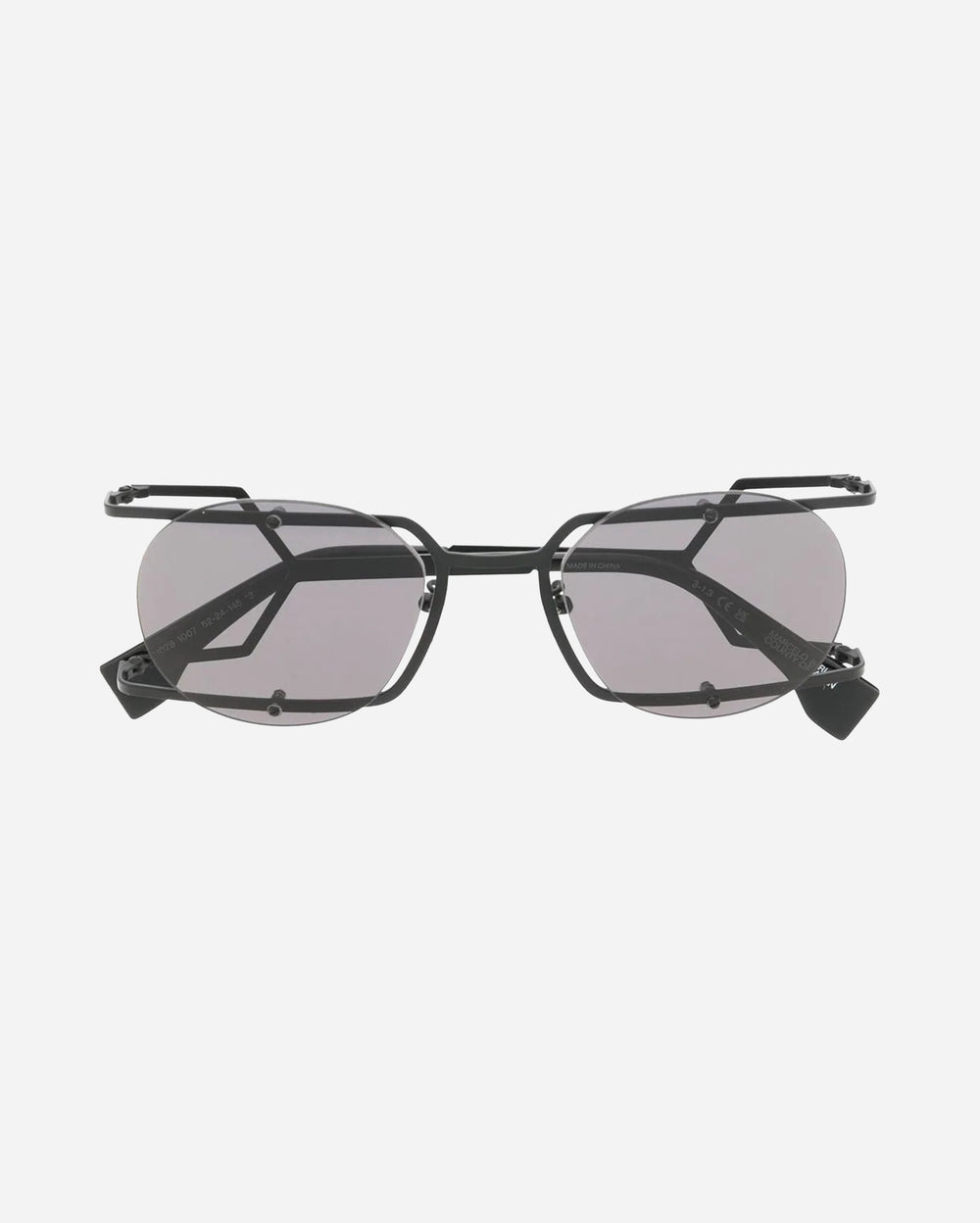Lentes de metal negro tintados en gris, lentes con protección UV, lentes redondas, marco cuadrado, placa del logo en el brazo, brazos rectos, puntas curvas.
