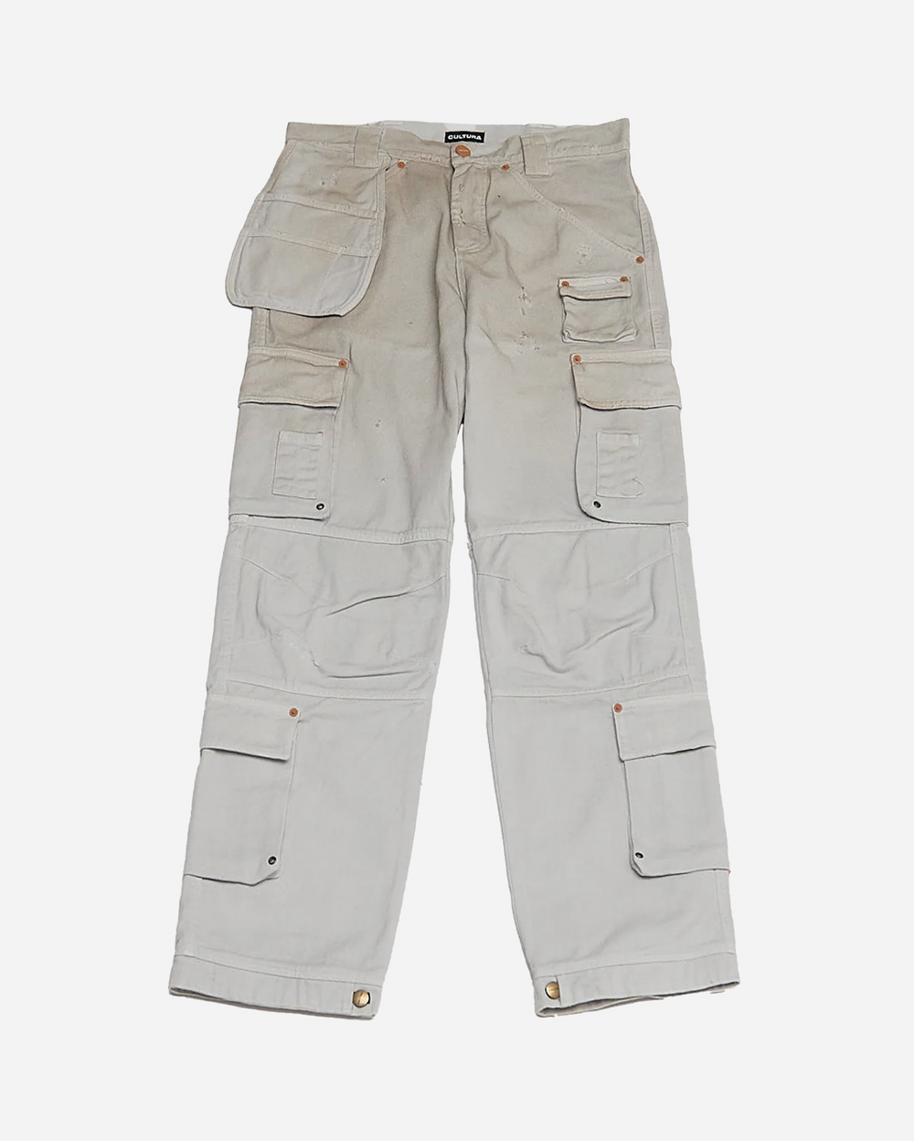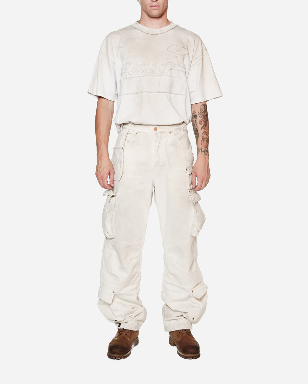 Relaxed-fit cargo pants, packed with pockets and finished with buttoned cuffs, ranging from a wide, draped leg to a sleek, slim fit. Crafted from distressed white fabric with a dusty patina, they evoke authentic desert expedition clothing and the harshness of the Paris-Dakar rally.