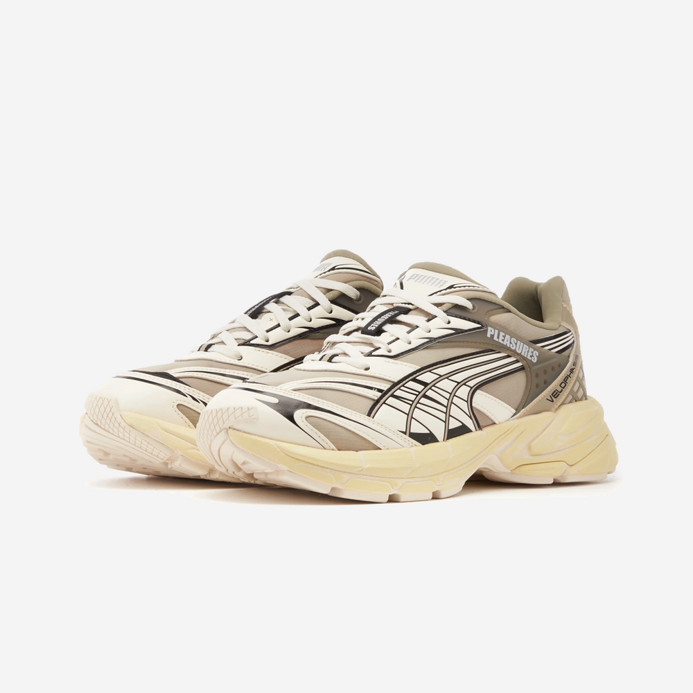 The PUMA x Pleasures Velophasis blends futuristic design with early-2000s running aesthetics. Featuring a beige and cream color palette with bold black detailing, this sneaker stands out with its dynamic lines, chunky silhouette, and premium material mix.