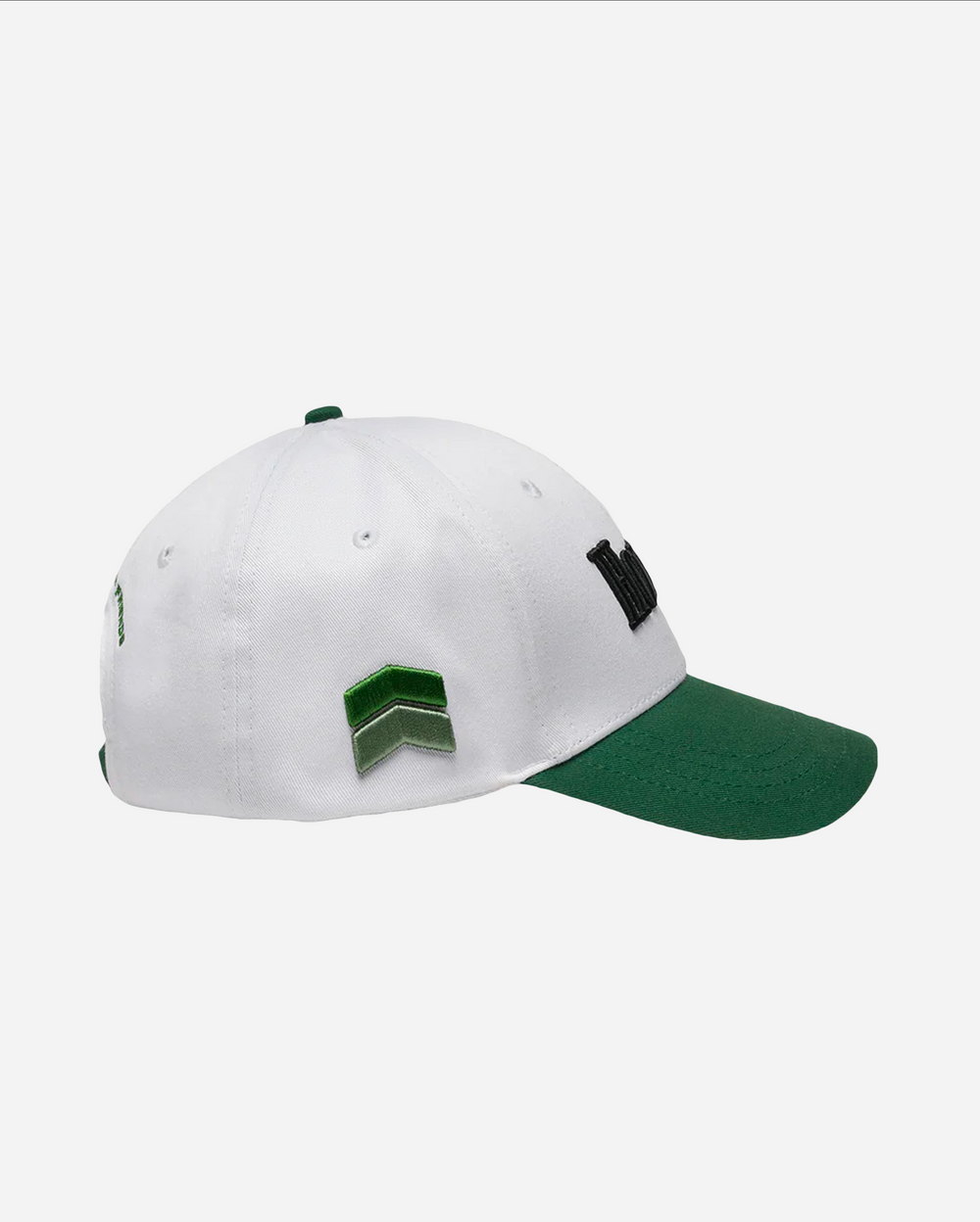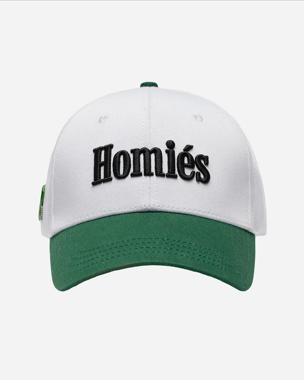 Baseball cap with base in white and visor in green. Featuring embroidered “Homiés” in black on the front, Racing graphic embroidered on the side and we can’t forget about our “Selected Fine Friends” quote also embroidered in green on the back.