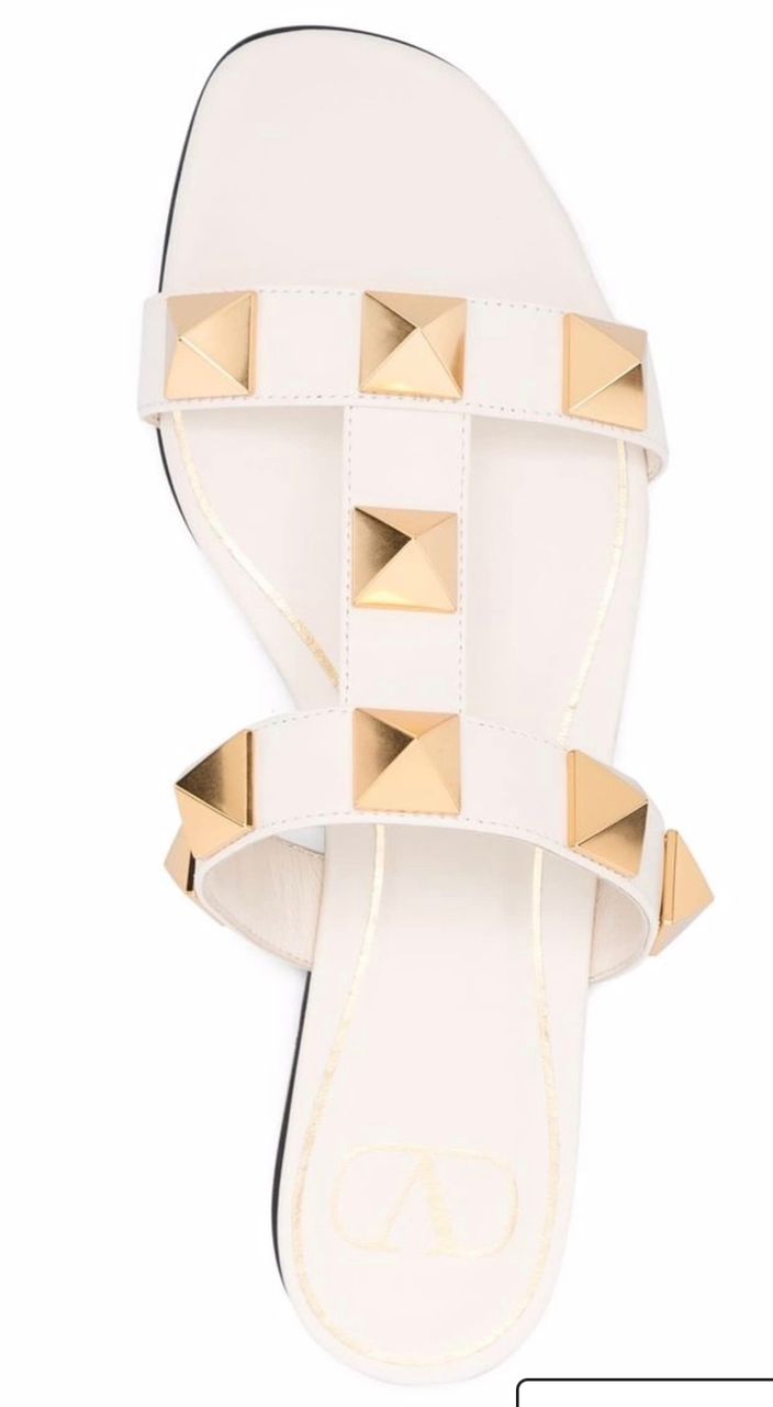 Eleva tu estilo veraniego con la sofisticación audaz de las sandalias Valentino Roman Stud Flat Slides. Confeccionadas en exquisita piel de becerro blanca, estas sandalias planas irradian lujo y modernidad. El diseño distintivo presenta múltiples tiras que cruzan el empeine, cada una adornada con las icónicas tachuelas Roman Stud de Valentino en un acabado dorado brillante. Estas tachuelas de gran tamaño, inspiradas en la arquitectura romana, aportan un toque de rebeldía elegante y reconocible al instante.