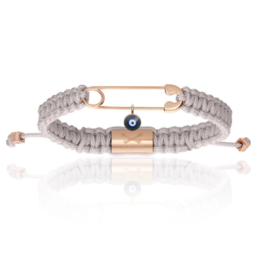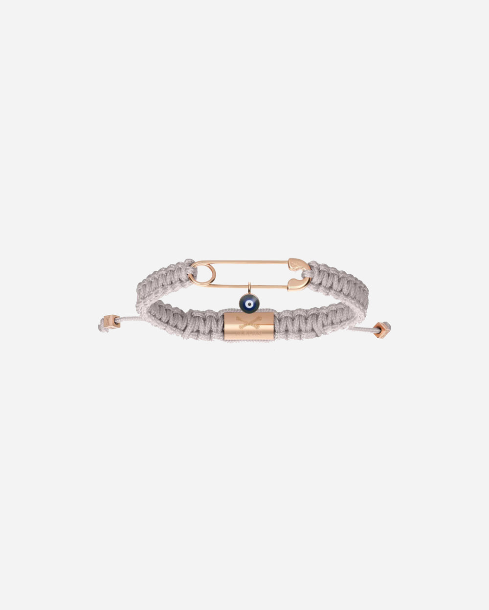 Esta pulsera presenta una banda de poliéster tejido gris y un cierre de imperdible chapado en oro rosa. Del imperdible cuelga un pequeño dije redondo que simula un mal de ojo. La pulsera también presenta pequeños detalles metálicos geométricos en los extremos de los cordones ajustables.