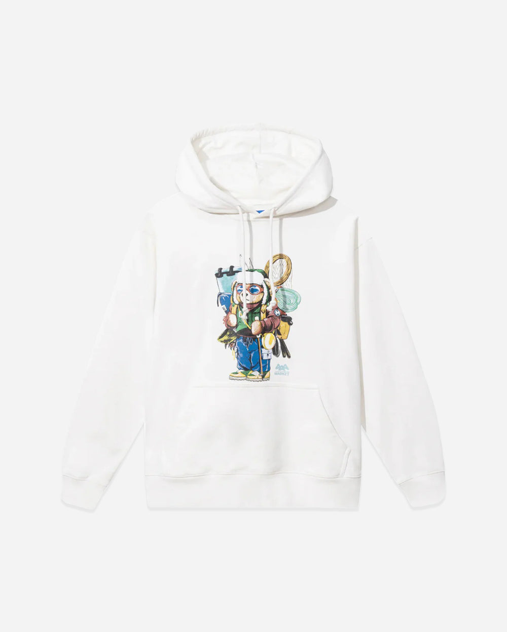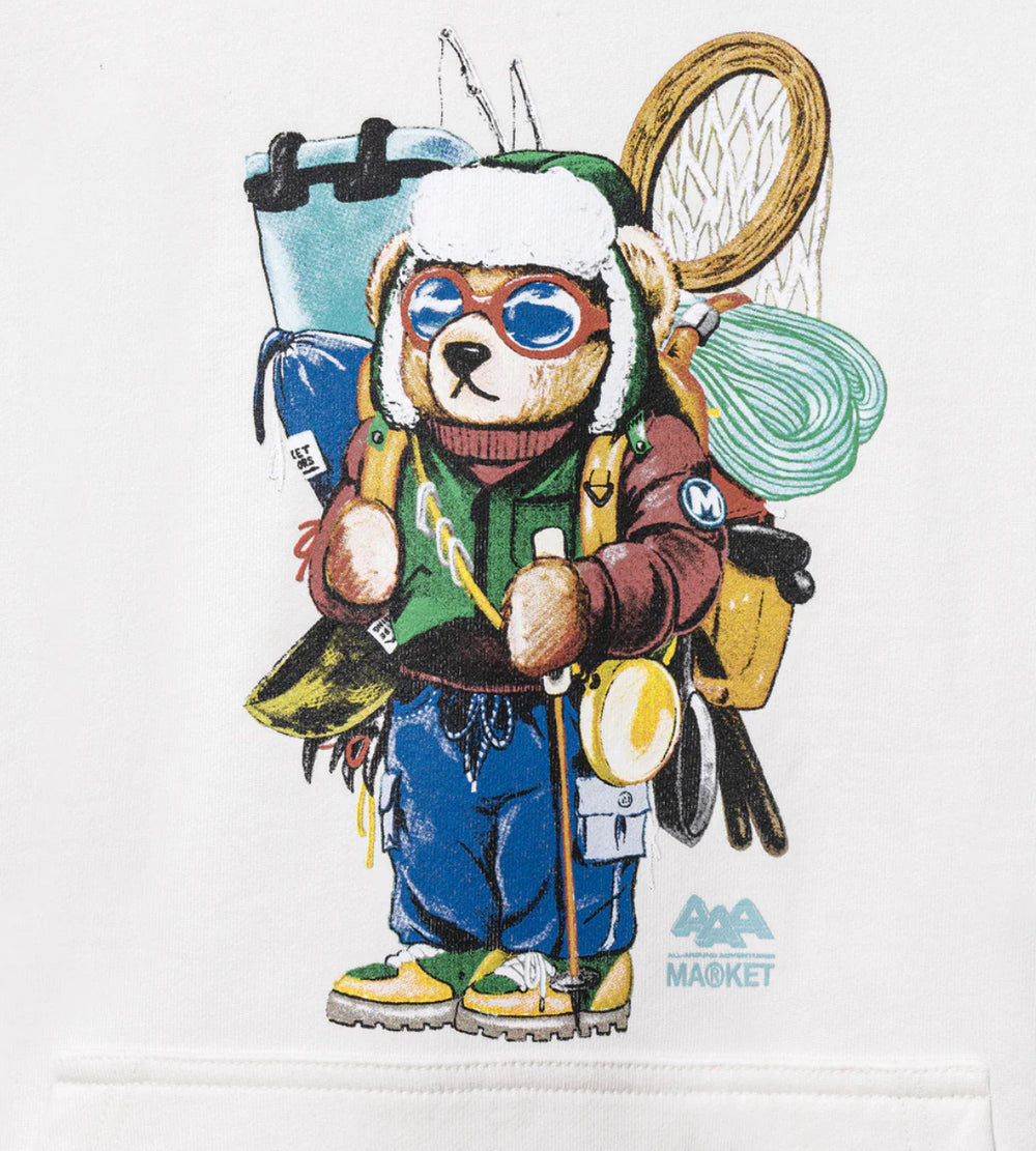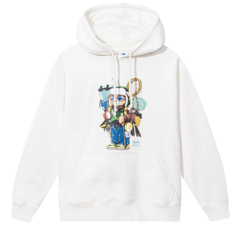 Bring playful energy to your wardrobe with the Market Ultralight Bear Hoodie. This clean white pullover features a vibrant, detailed graphic of a cartoon-style bear adventurer, packed with gear and personality. The illustration adds a fun, artistic touch that stands out while keeping the overall look fresh and modern.