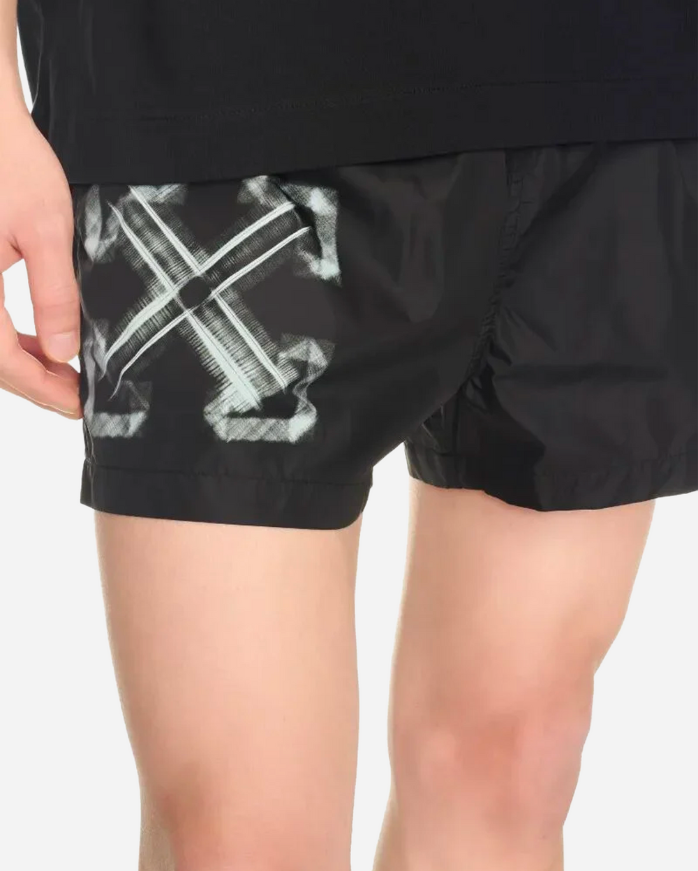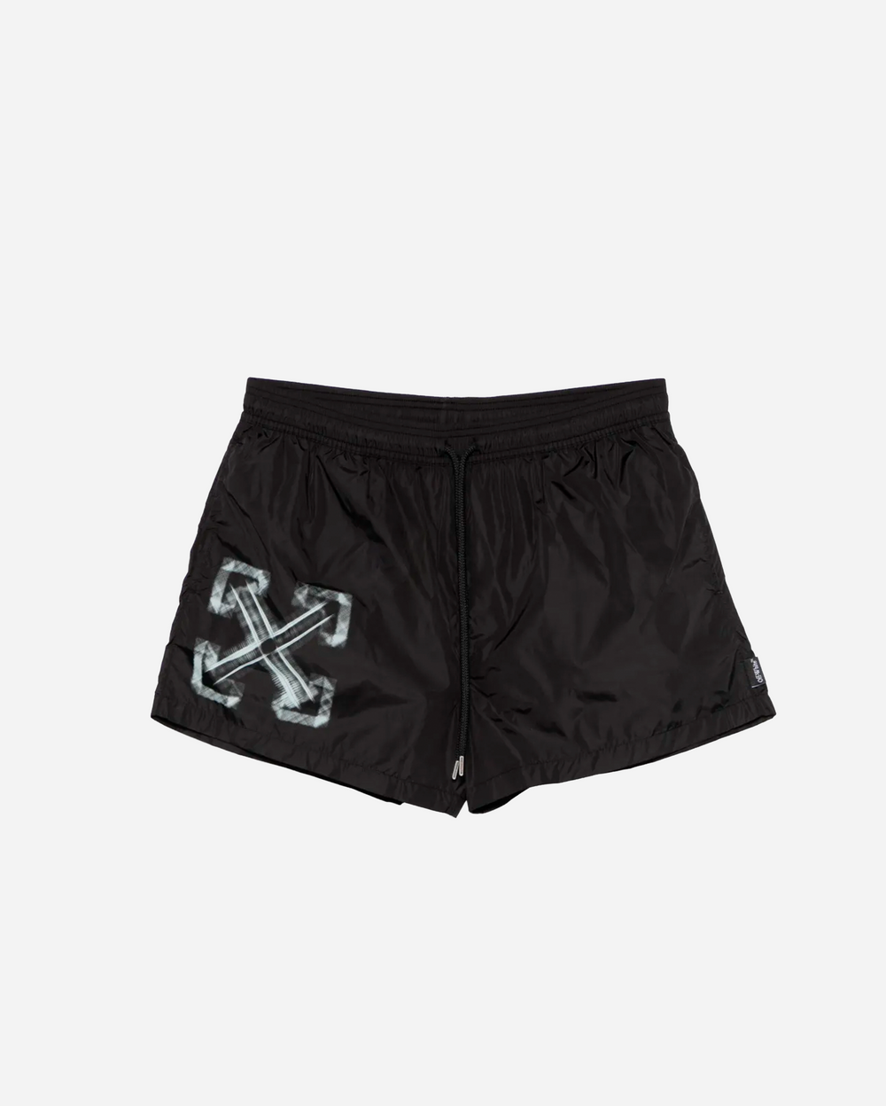 The standout detail is the iconic Off-White Arrow logo printed in a hazy, motion-blur style—adding an experimental, street-forward edge to an otherwise clean design. Built for versatility, they’re just as strong poolside as they are styled casually with a tee or oversized shirt.