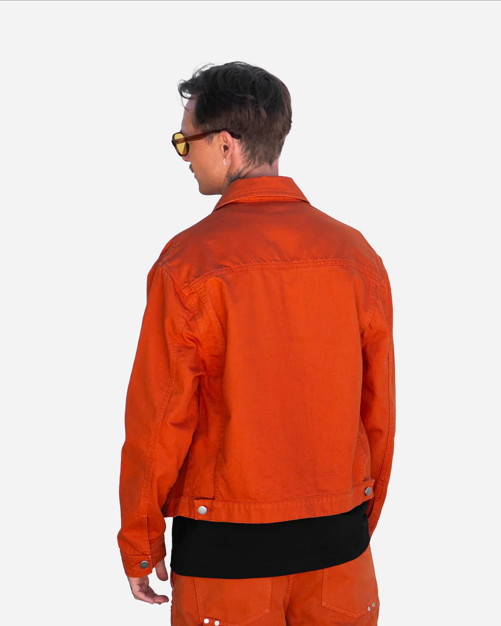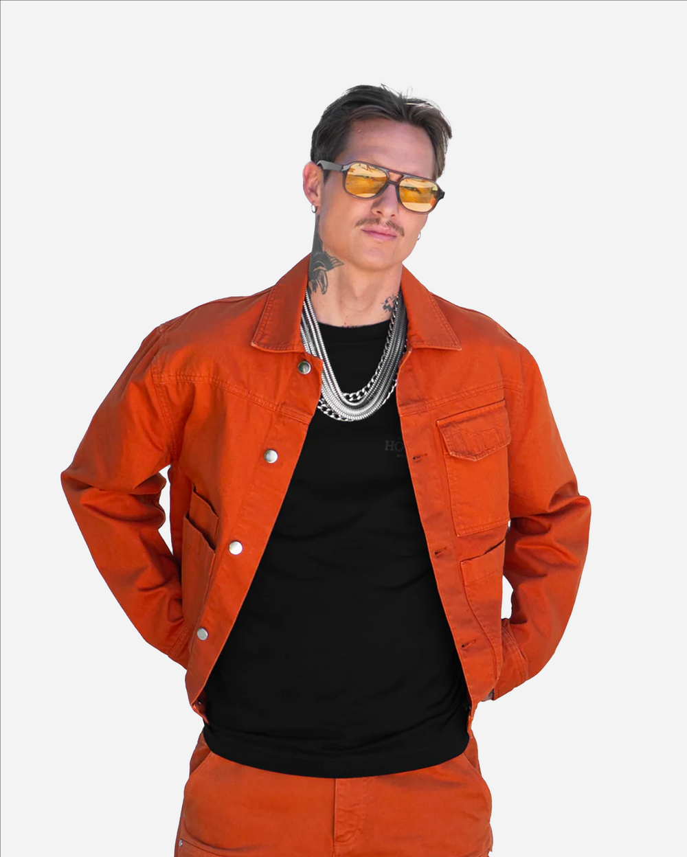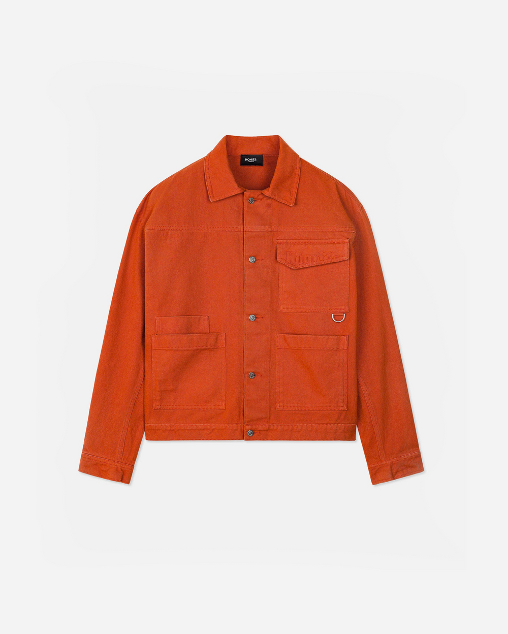 A cotton twill jacket in terracotta with a washed finish. It features an embroidered Homies logo on the front flap, silver metal buttons with a logo embossing and double stitching with heavy thread. Designed for both style and functionality, it’s the perfect layering piece to add to your wardrobe for the FW24-25 season.